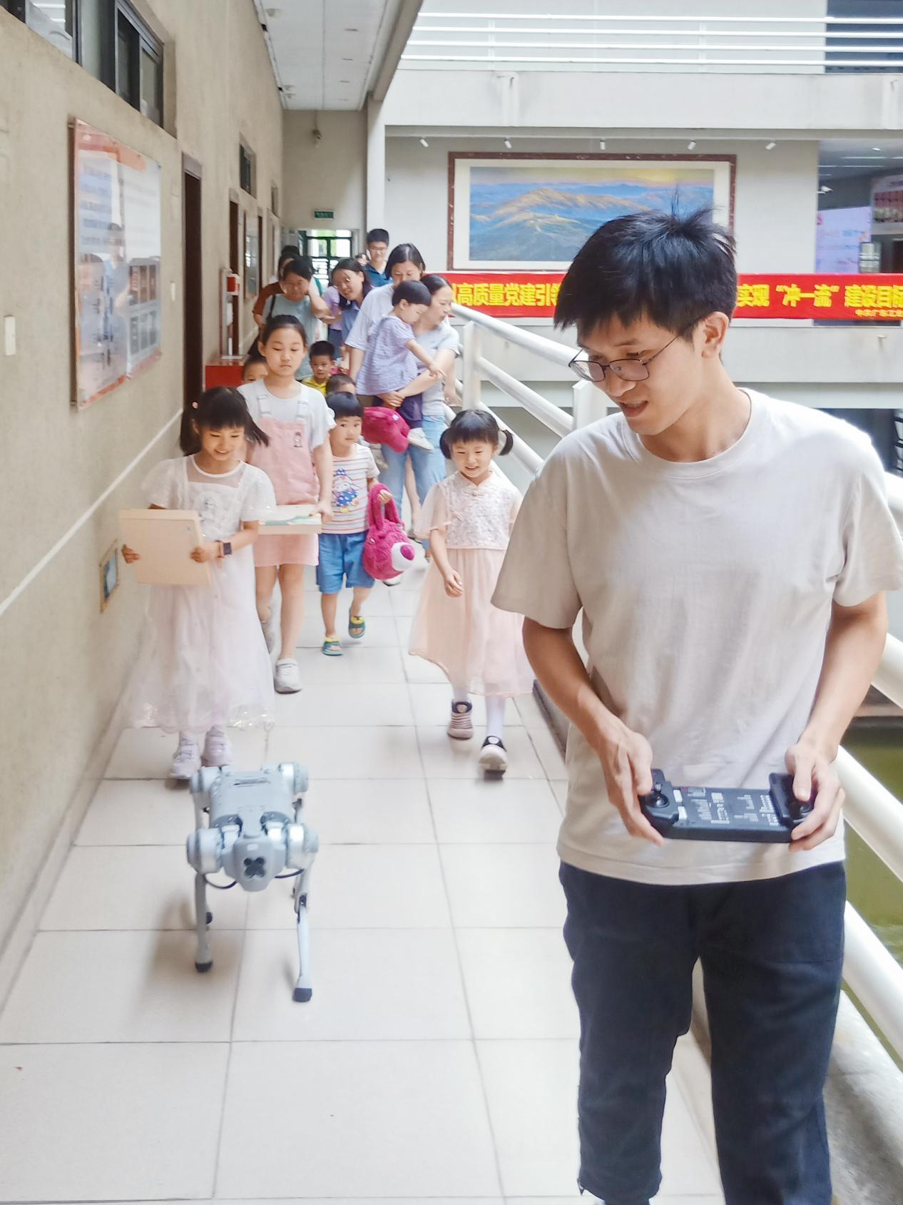 “妈妈你看,这只机器狗会跳舞诶!好有趣啊!”6月1日这天,广工自动化学院科技成果之一“机器狗”成了颇受欢迎“明星”,躺下、站起,作揖、问好,系列流畅的动作引来萌娃们阵阵掌声和欢呼。