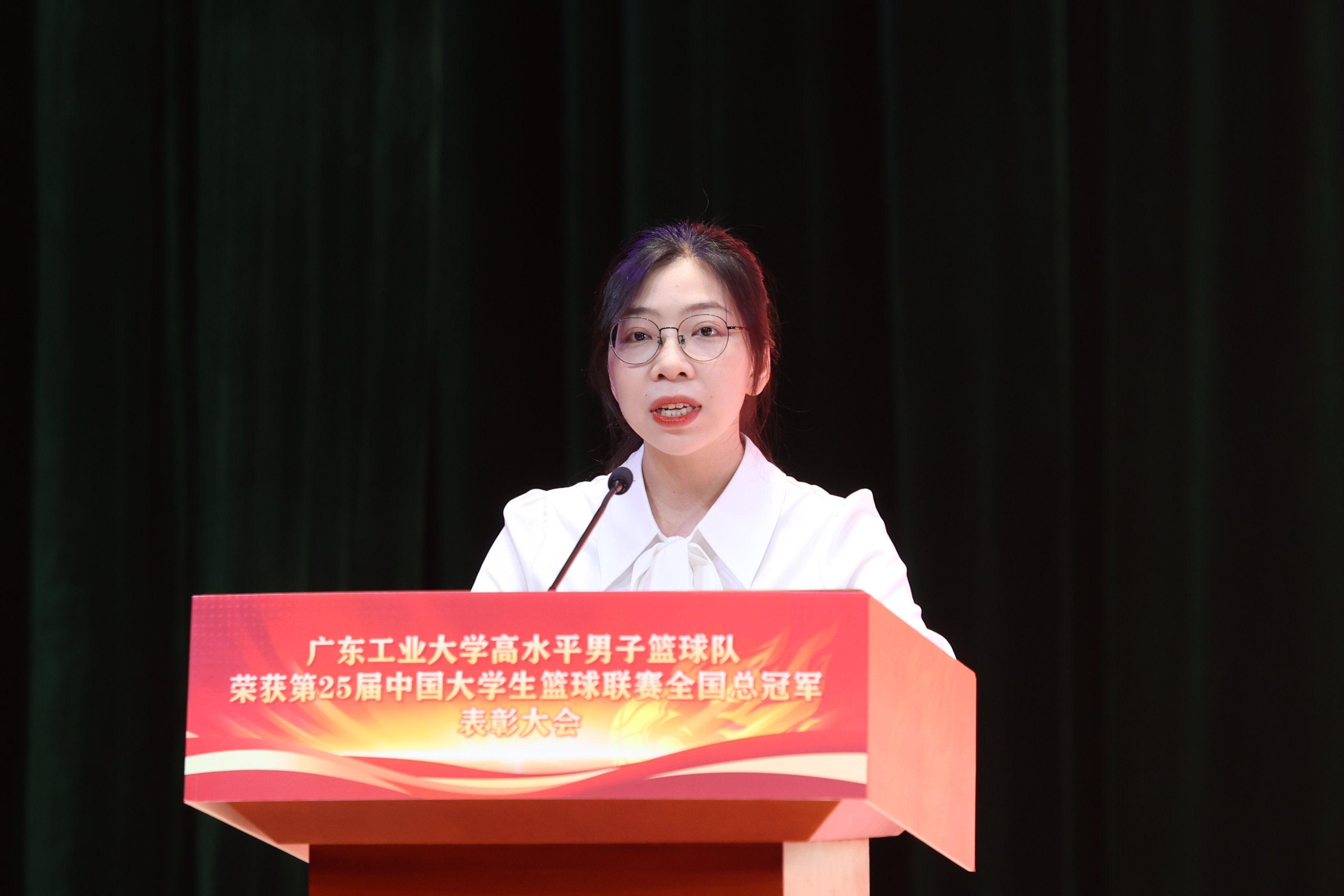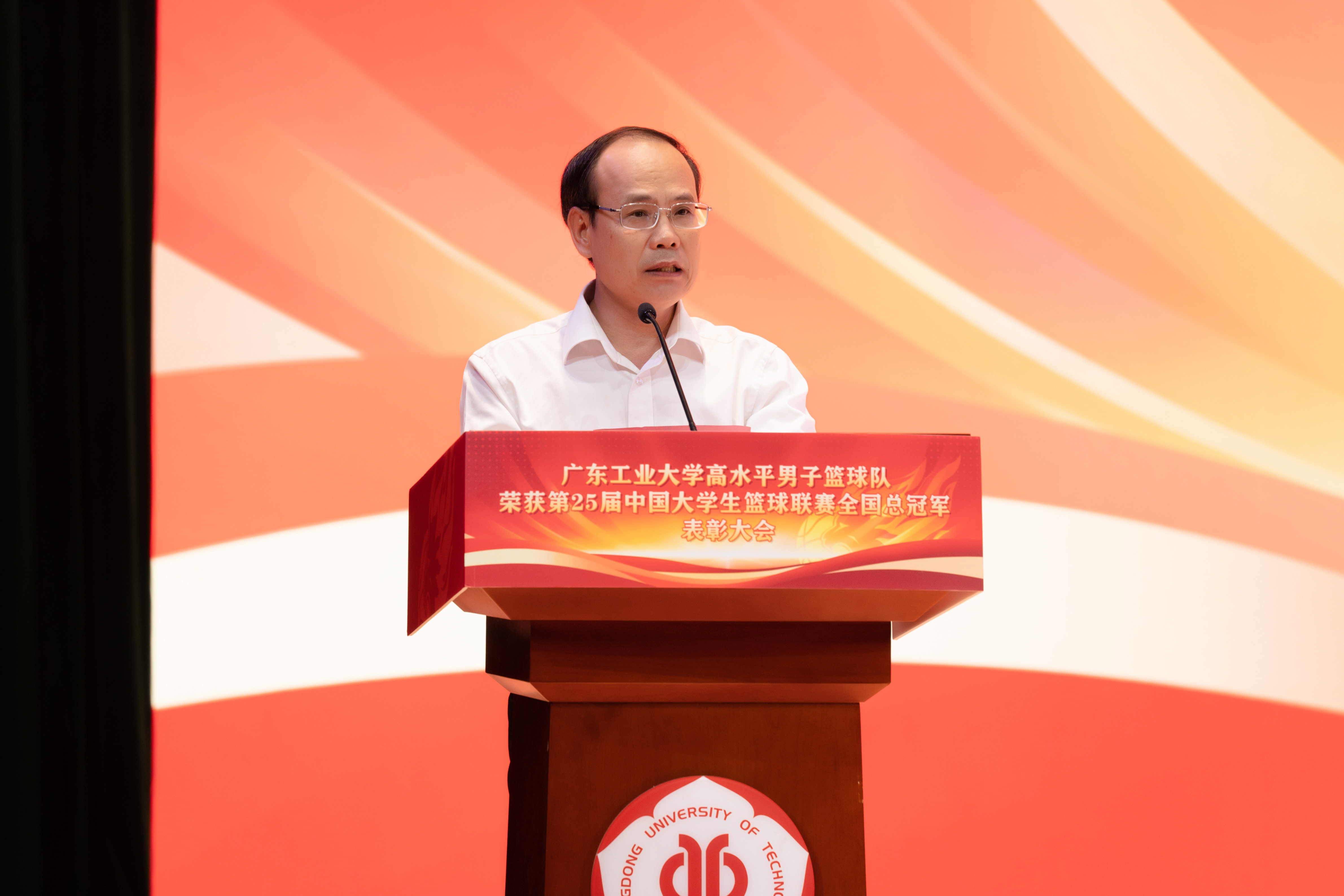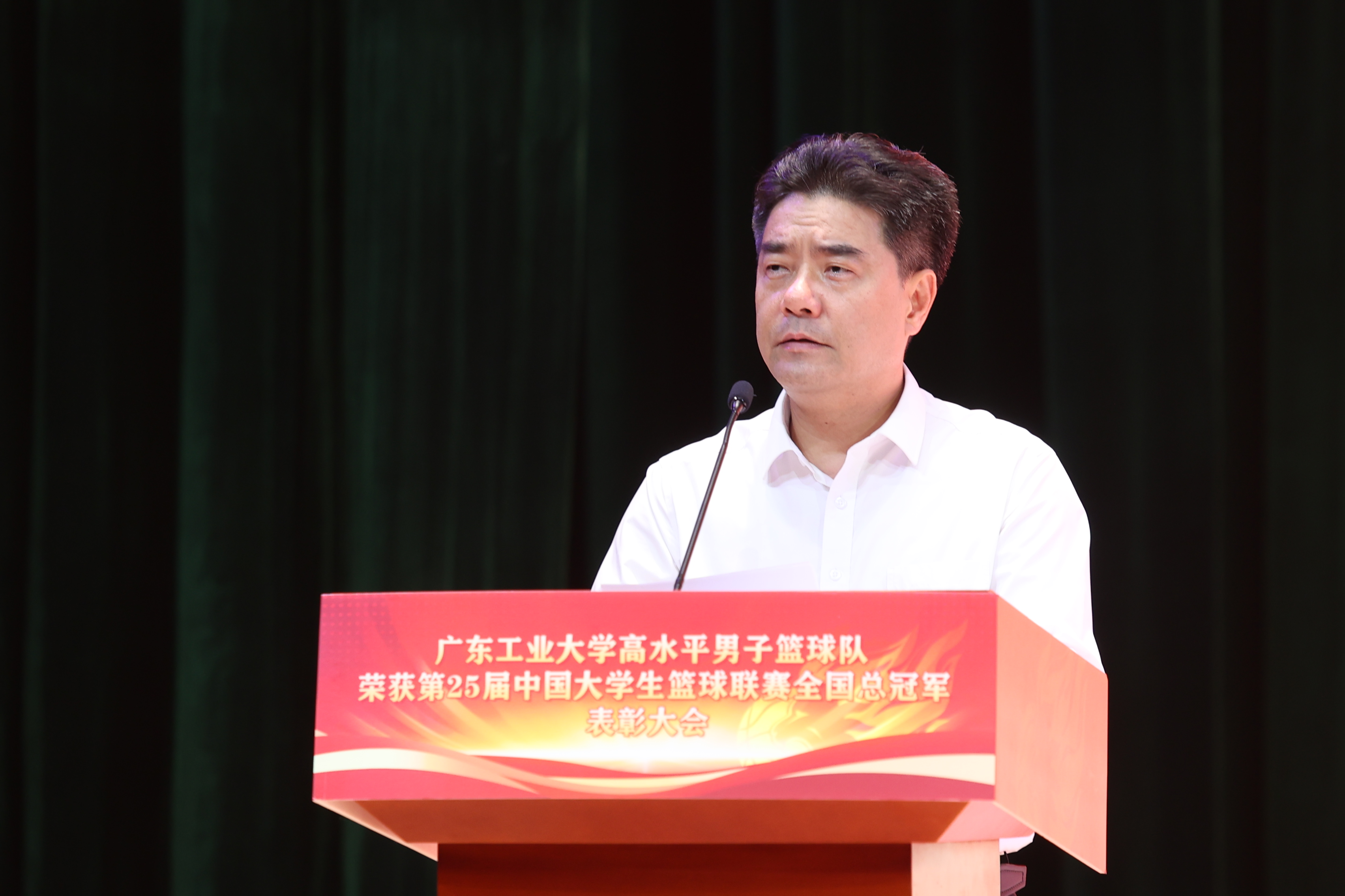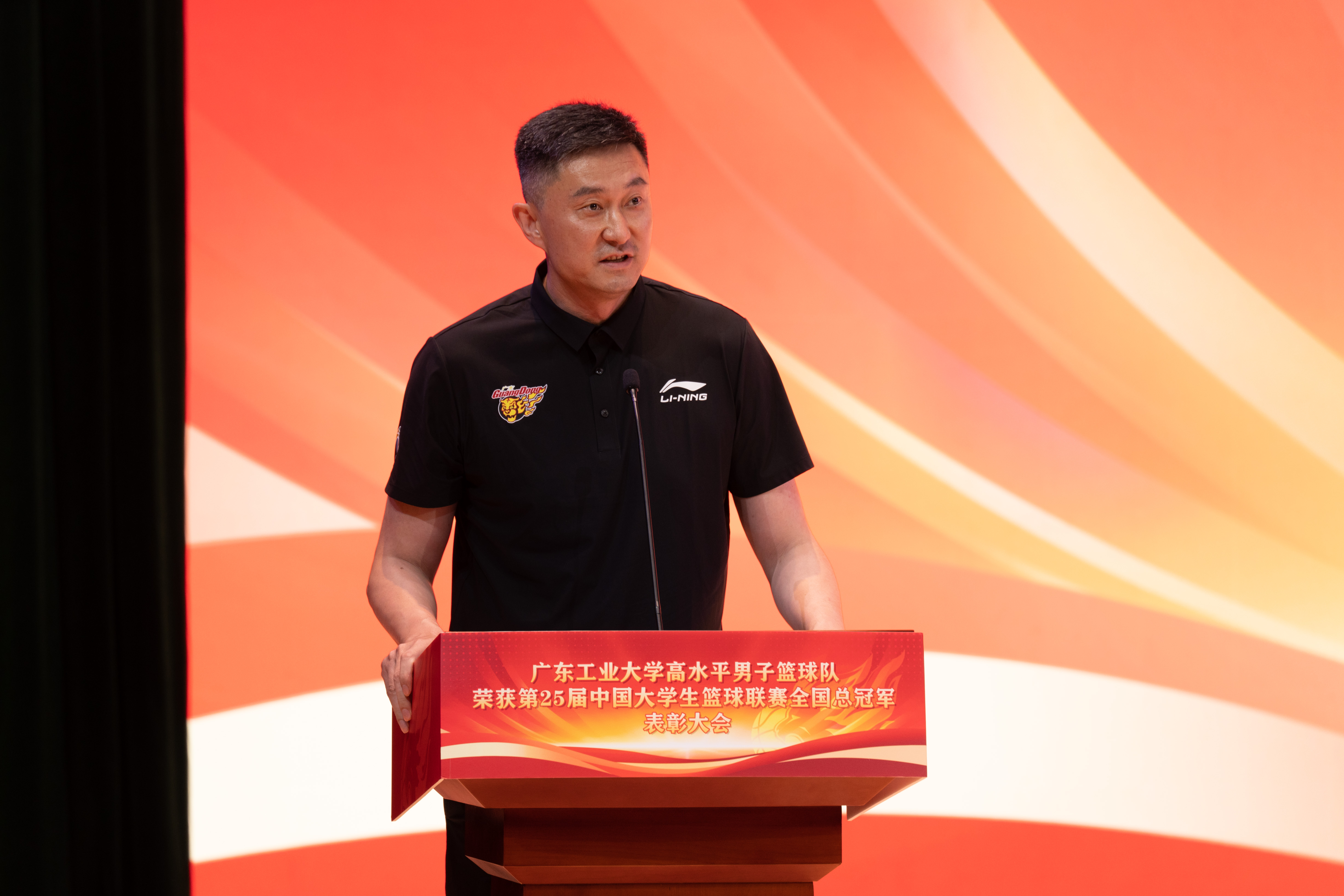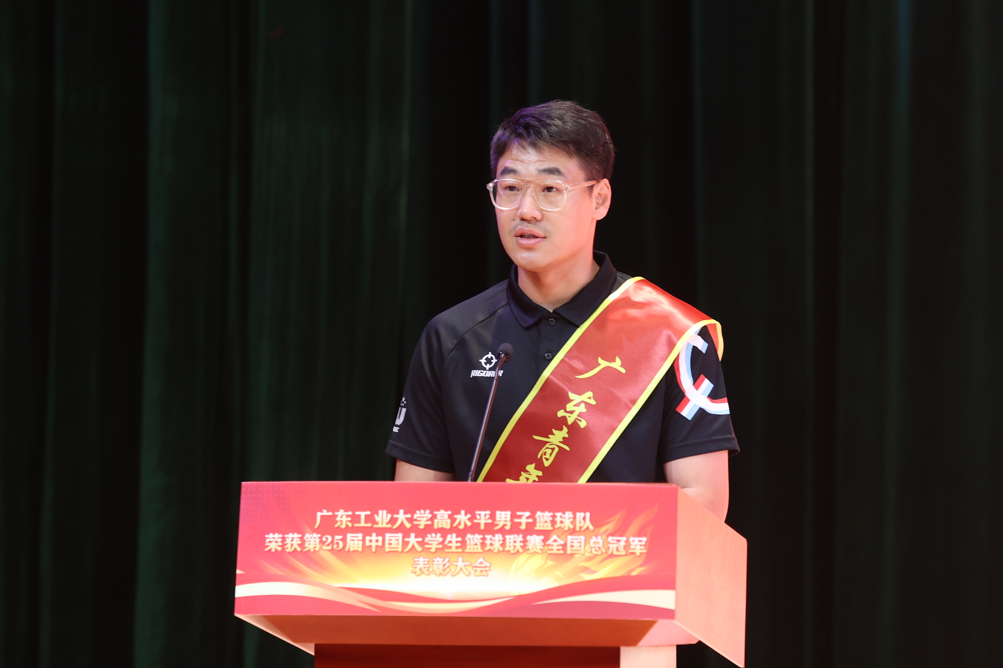 邱学青宣读学校《关于表彰高水平男子篮球队的决定》。学校男篮是新时代广工青年集体的优秀代表。他们展现了脚踏实地、笃行不怠的实干品格,迎难而上、追求卓越的拼搏精神,敢于胜利、为校争光的进取特质,以强烈的历史主动精神寻求突破和超越。为弘扬学校男篮精神,经学校研究决定,授予广工男子篮球队“九游注册先进集体”称号。学校希望全体师生以男子篮球队为榜样,踔厉奋发、勇攀高峰,为全面推进高水平创新型大学建设作出新的更大贡献,为全面建设社会主义现代化国家、全面推进中华民族伟大复兴而团结奋斗。