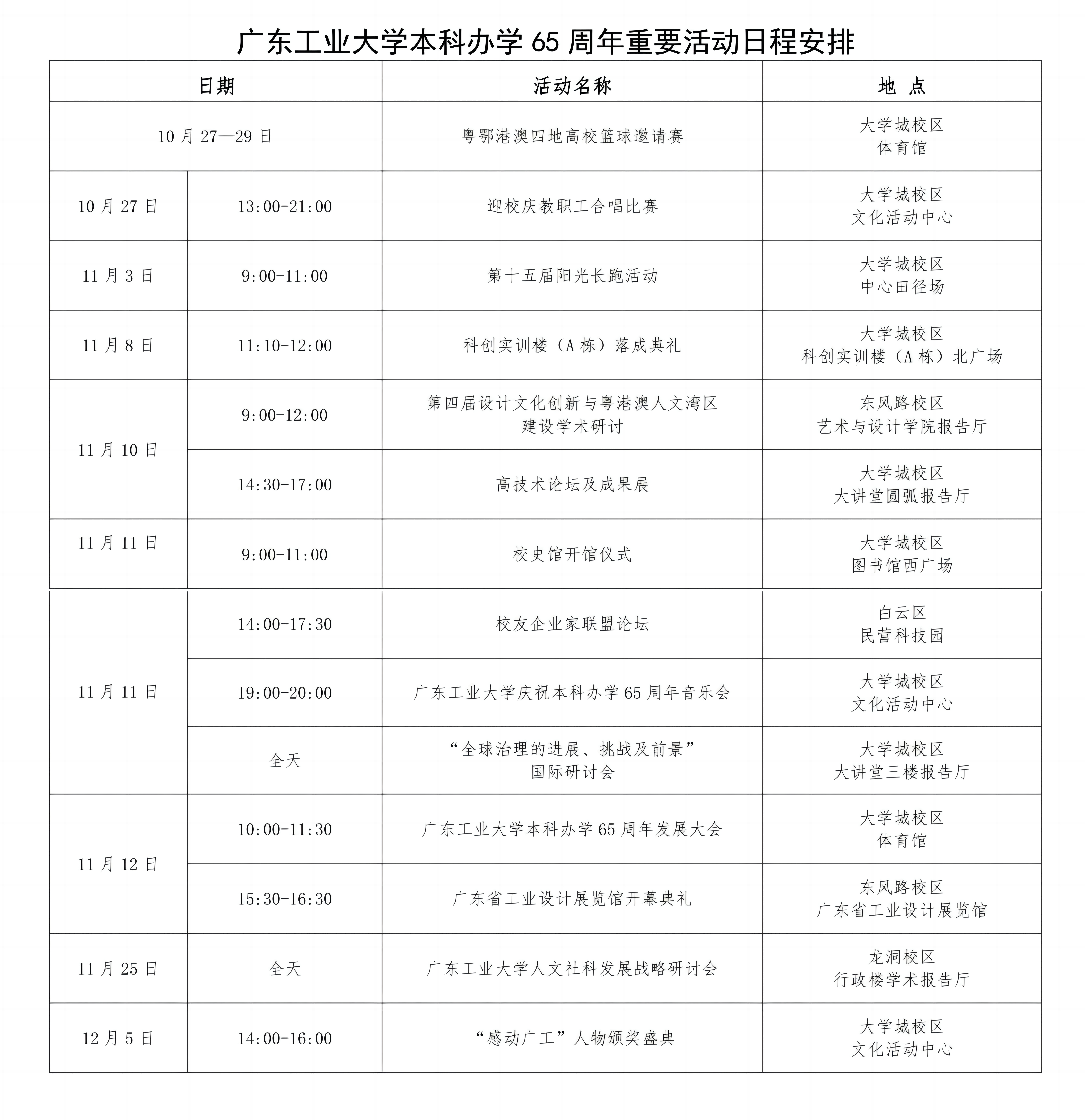 同心逐梦,盛举齐襄。学校将以“逐梦新征程 攀撑创未来”为主题,围绕“学术校庆、人文校庆、暖心校庆”的定位,于2023年11月12日隆重举行本科办学65周年发展大会,届时将进行网络直播。校庆期间,学校还将举办高技术论坛及成果展、校友企业家联盟论坛、科创实训楼落成典礼、校史馆开馆仪式、广东省工业设计展览馆开馆典礼、校庆主题音乐会、“感动广工”人物颁奖盛典等系列活动。