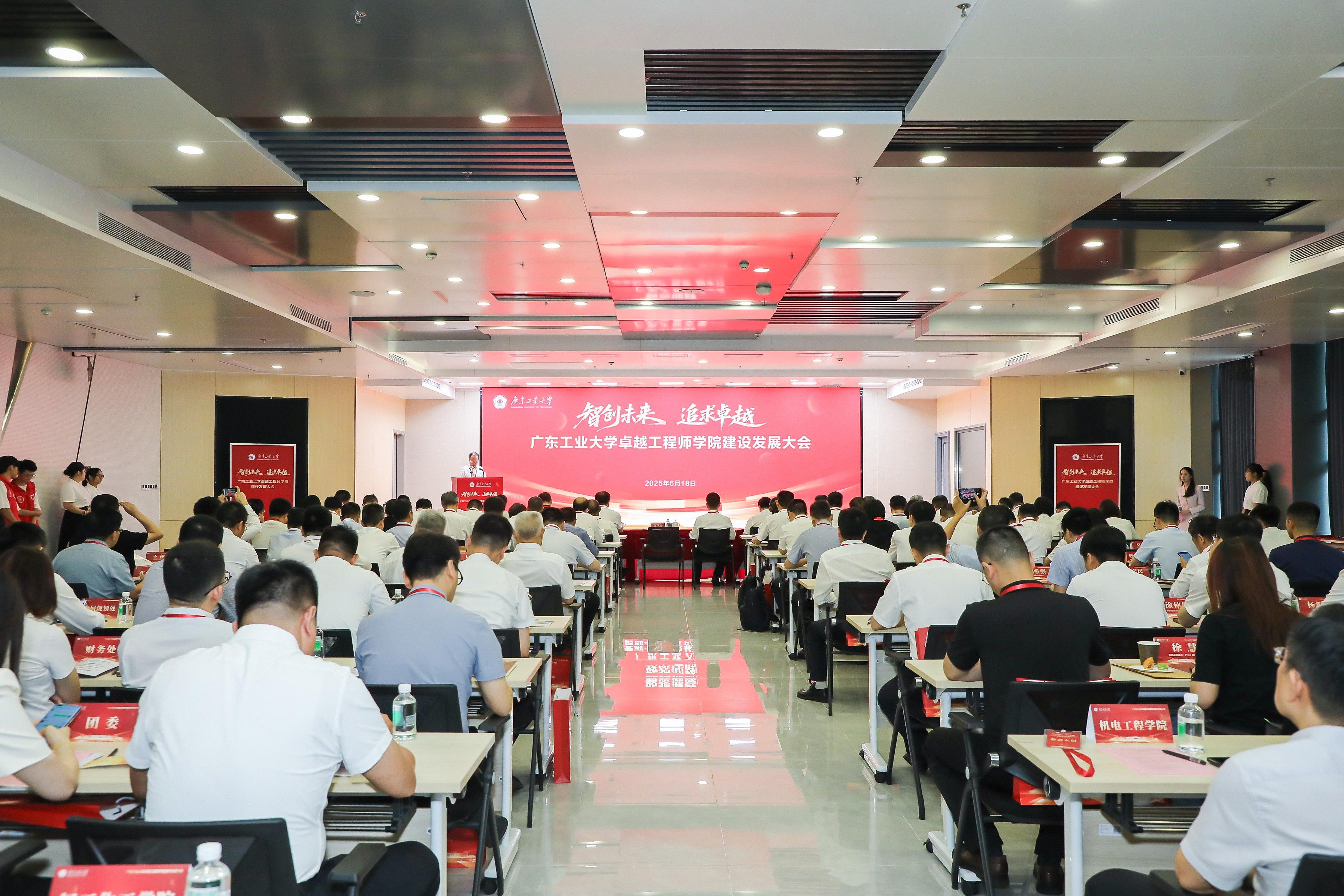 广东省教育厅二级巡视员陈健生,广东省科学技术厅二级巡视员黄江康,广东省工业和信息化厅总经济师邹勇兵,广东省国资委一级调研员王文川,中国学位与研究生教育学会副秘书长赵忠升,广工党委书记白建刚,校长邱学青,党委副书记朱蔚蔚、陈卓武,党委常委、副校长鲁仁全,党委常委、纪委书记、广东省监委驻九游注册监察专员庞建国,党委常委、宣传部部长张育广出席会议。兄弟高校代表、企业及科研机构理事单位代表,广工机关部处、学院相关负责人和师生代表参会。广工党委常委、副校长,卓越工程师学院院长杜承铭主持会议。