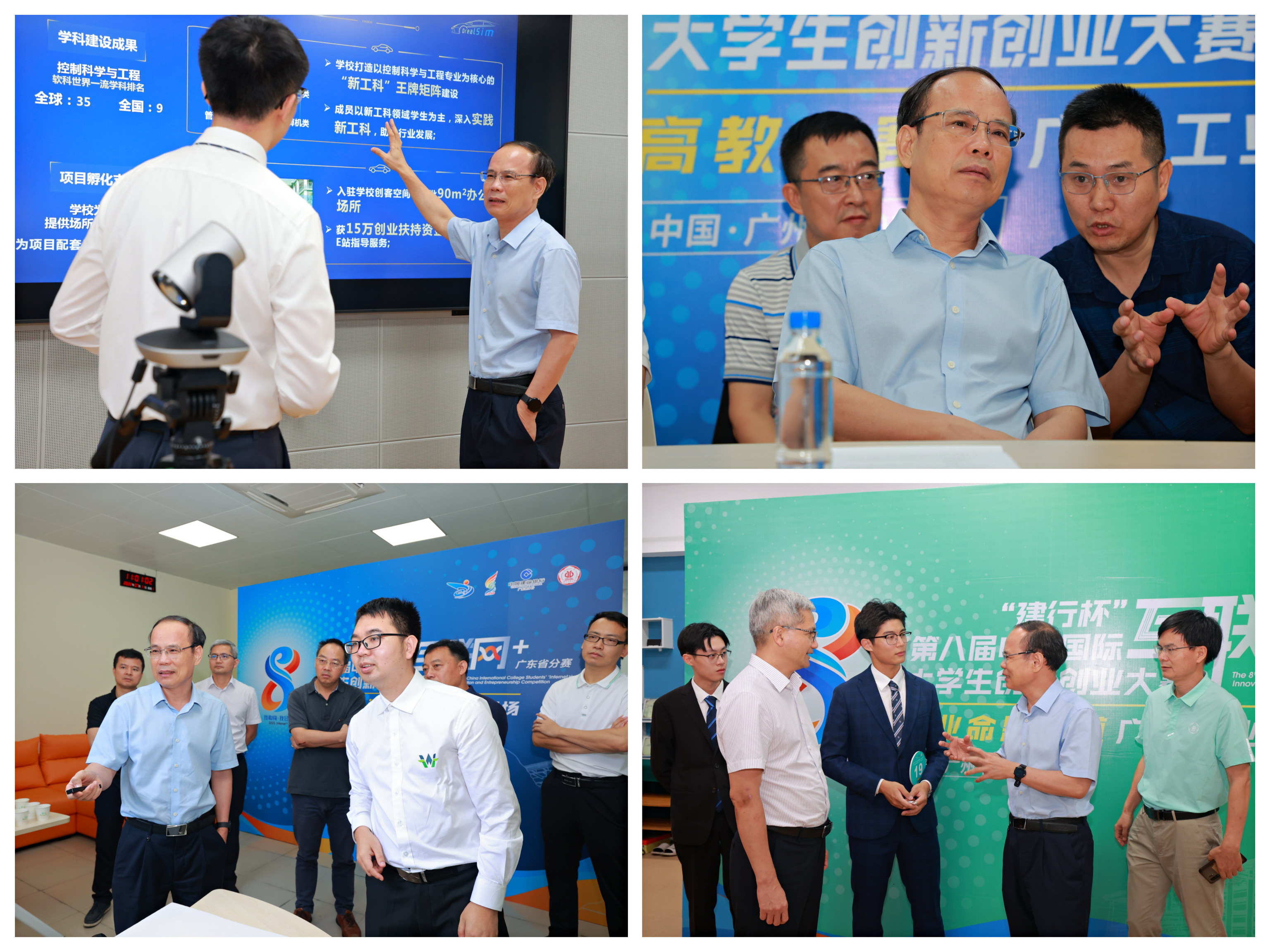 邱学青一行观摩了当天举办的线上赛前模拟赛和优秀项目成果展,详细调研指导了各个答辩展示室的软硬件设施搭建情况。他对学生工作处、后勤管理处、网络信息与现代技术中心等赛事组织和支持部门的精心筹备和全力保障给予了高度肯定,对一直以来辛勤付出、勤奋进取的备赛团队,认真负责、用爱陪伴学生成长的指导老师、相关学院的负责人和赛事组织工作人员表达了衷心感谢,在现场仔细询问了本届赛事的进展情况和备赛过程中的难点、重点。邱学青与各个备赛团队进行了深入交流,对项目路演展示、答辩环节等给予了指导。他指出,中国国际“互联网+”大学生创新创业大赛是全球范围内规模最大的大学生创业大赛,是双创育人、思创融合的大舞台,更是高校学科专业综合实力的大比拼。他希望参赛师生继续传承“我敢闯,我会创”的大赛精神,全力冲刺、自信登场,在省决赛乃至国赛的舞台上展现出广工双创青年“务实进取、勇于攀峰”的精神风貌,争做“融入产业、创新担当”的新时代攀登者和答卷人。同时,要深入贯彻以赛促育、以赛促学、以赛促创,真正依托高水平创新创业竞赛平台推进科技成果转化落地和乡村振兴,促进产学研融合,为学校“1+2+3”攀撑计划学科提升工程的实施添砖加瓦。