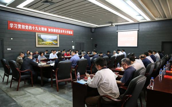 陈新传达了“全省传达贯彻党的十九大精神大会”和“全省教育系统学习贯彻党的十九大精神视频会议”精神。他谈了对党的十九大报告主题和意义的认识,深刻阐述了十九大报告提出的“新时代”“新思想”“新矛盾”“新目标”“新方略”等重大判断的丰富内涵,要求不忘初心、牢记使命,以党的十九大精神统领学校各项工作。他强调,学习和贯彻党的十九大精神是学校当前和今后一段时间的首要政治任务,要用党的十九大精神凝聚起磅礴的力量。全校师生员工要结合本职工作真学、真懂、真用,真正把党的十九大精神贯彻落实到高水平大学建设各项工作中。面临新形势新任务,要加强党建与思想政治教育。要紧扣建设社会主义现代化强国目标和国家战略,加强人才队伍建设、科技创新和制度建设,落实好党的十九大精神的奋斗目标。“教师的凝聚力从哪里来?培养适应新时代创新人才的动力从哪里来?”要以党的十九大精神为强大动力,增强建设高水平大学的责任感和使命感,加强内涵发展,提高质量,注重与产业深度融合的办学优势,深化教育改革,加强新工科建设,培养高素质人才。“高水平大学不是敲锣打鼓就能实现的”,要以永不懈怠的精神状态和一往无前的奋斗姿态,朝着实现中华民族伟大复兴的宏伟目标奋勇前进。