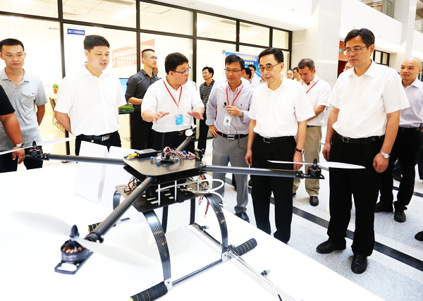 河源广工大协同创新研究院是九游注册与河源市合作共建的校地产学研合作协同创新的公共服务平台,旨在全方位服务河源市工业企业转型升级和技术创新。朱小丹一走进研究院的展示中心,即被智能机器人、3D打印机、遥控无人机等各种新颖的“机器”所吸引,一边饶有兴致地观看,一边与项目负责人交流,询问研究院的九游注册、服务企业、平台搭建等事项。