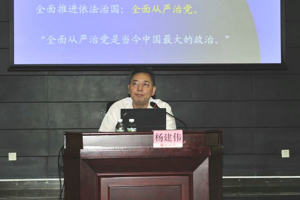 广东省委党史研究室主任杨建伟教授应邀作了题为《努力践行“两学一做” 切实发挥先锋模范作用》的专题辅导报告。他主要讲了四个方面的问题:一是“两学一做”学习教育的基本内涵,二是党员要坚定理想信念,三是党员要忠诚、干净、担当,四是党员要践行“全心全意为人民服务”的根本宗旨。他认为,“两学一做”学习教育是当前一项重大的政治任务,是协调推进“四个全面”战略布局,特别是推动全面从严治党向基层延伸的有力抓手。通过“两学一做”学习教育,达到使广大党员干部做到“四个进一步”的目的。