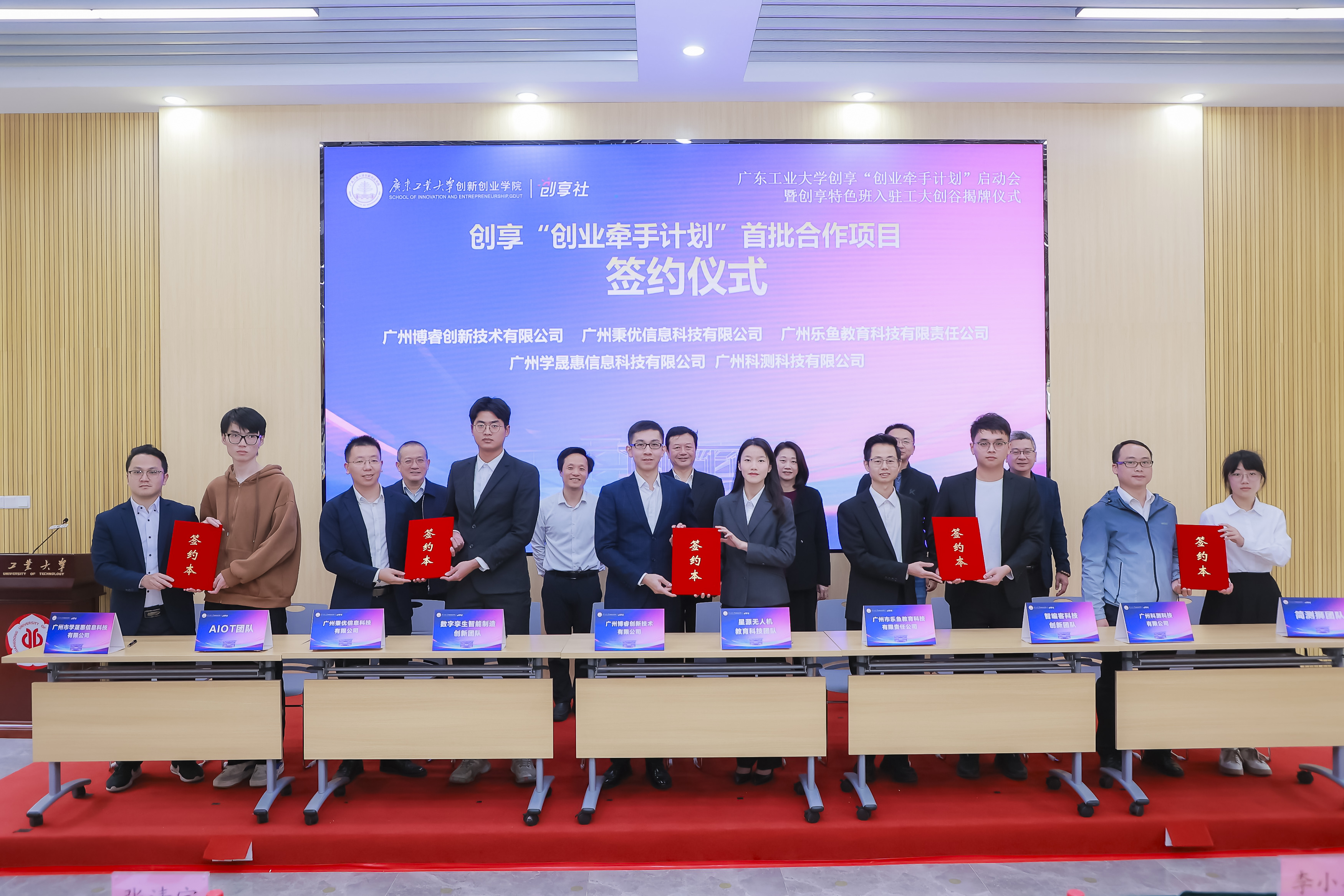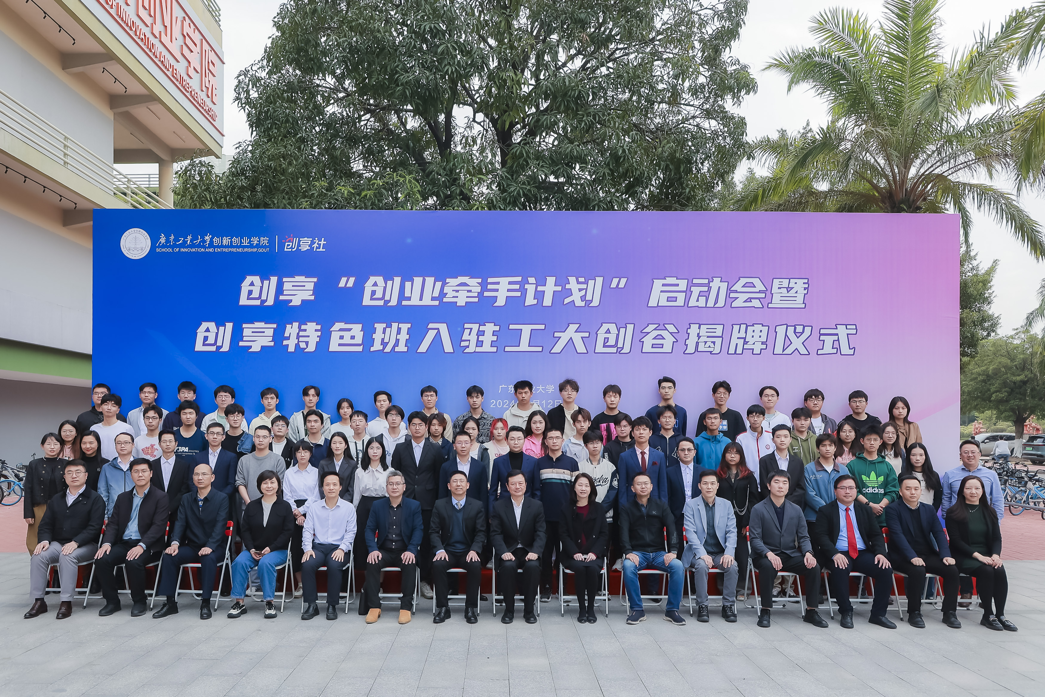 广州大学城管委会、南方医科大学创业学院、广东技术师范大学创新创业学院相关人员,创业校友企业代表,学校发展规划处、教务处、学生工作处、研究生院、团委、对外事务及校友办公室、创新创业学院等部门负责人,创新创业学院工作指导委员会委员代表,创享长青班首席教授代表,创业牵手计划学生创业团队负责人,创享特色班学生团队负责人,工大创谷入驻团队师生代表等共90余人参加了仪式。