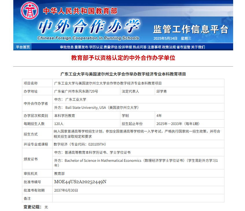 近日,教育部公布了中外合作办学项目的最新评审结果。广工与美国波尔州立大学合作举办数字经济专业本科教育项目在历经严格评审后,凭借突出优势以广东省排名第一通过评审答辩,这是自2012年九游注册与印度韦洛尔理工大学合作办学动画专业本科教育项目获批后,学校中外合作办学的又一重大进展。