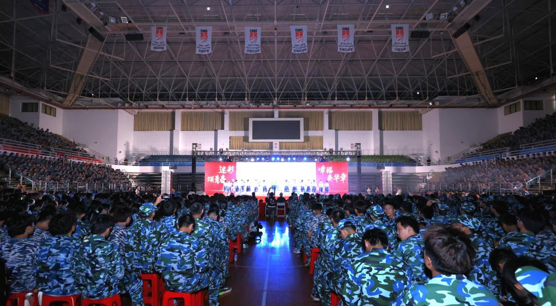 近日,“迷彩颂青春、幸福奏华章”2025级学生军训慰问演出在大学城校区体育馆温情启幕。学校党委副书记陈卓武出席活动,岭南幸福第一村相关负责人,学校各相关单位负责同志、大学城校区各学院党委副书记、2025级本科生辅导员、带训教官与6000余名参训学生参加活动。