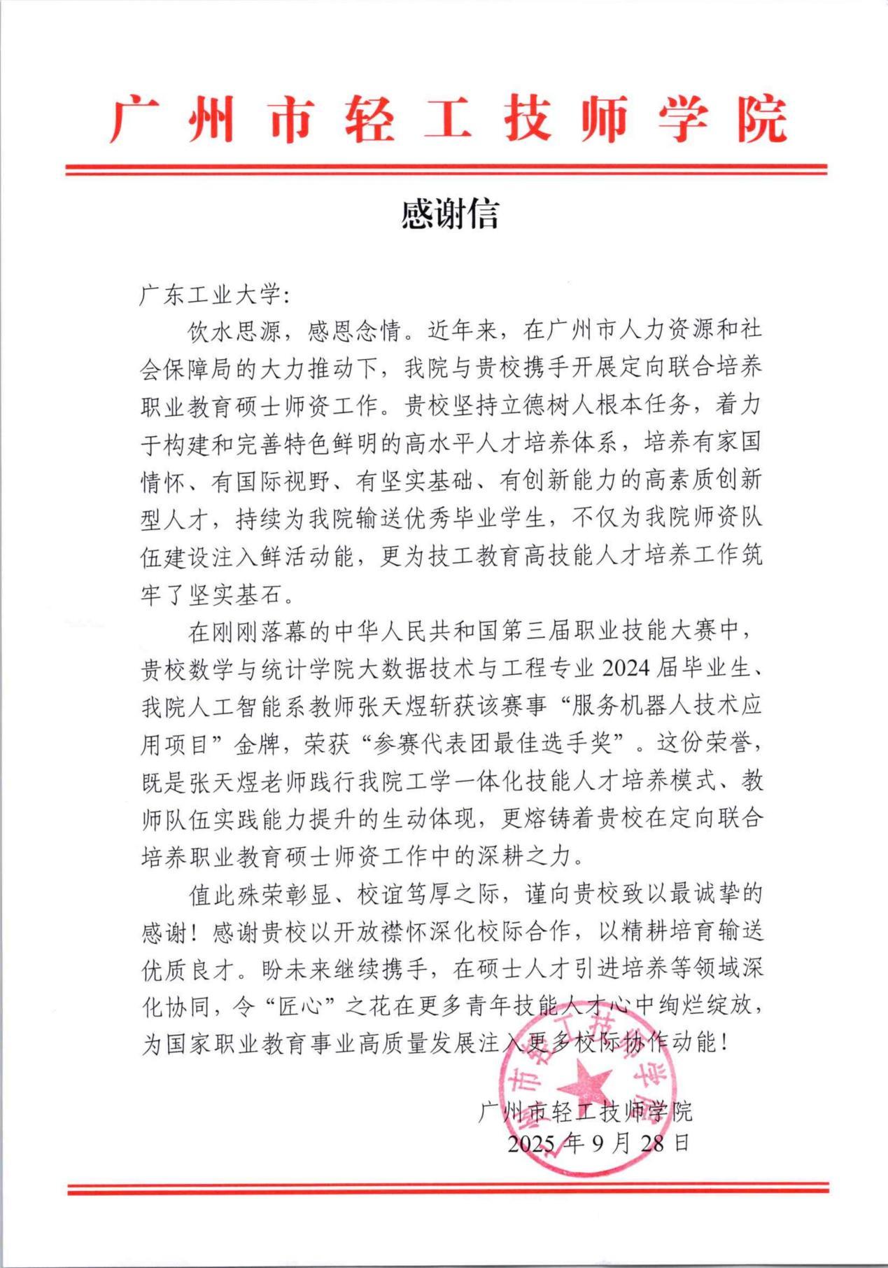 近日,广州市轻工技师学院致函学校,祝贺双方在“双师型职业教育师资”硕士研究生订单式联合培养项目中取得显著成果。在刚刚落幕的中华人民共和国第三届职业技能大赛中,数学与统计学院大数据技术与工程专业2024届毕业生、现任广州市轻工技师学院人工智能系教师张天煜,斩获“服务机器人技术应用项目”金牌,并荣获“参赛代表团最佳选手奖”。