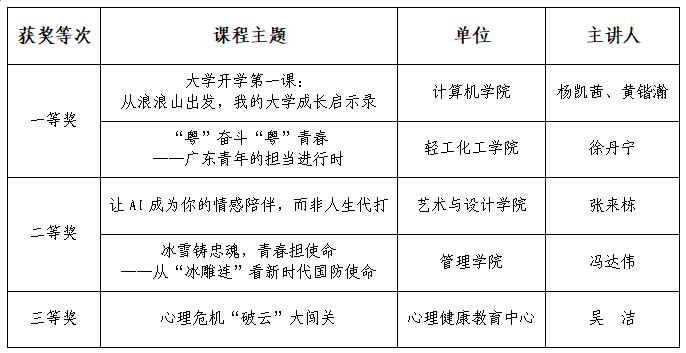 近日,广东高校网络思想政治工作中心、广东高校易班发展中心面向全省高校组织开展的2025年度广东高校新生入学教育微课征集活动结果公布,我校成绩优异,推选作品全部获奖,分别是一等奖2项、二等奖2项、三等奖1项,具体获奖名单详见下表。