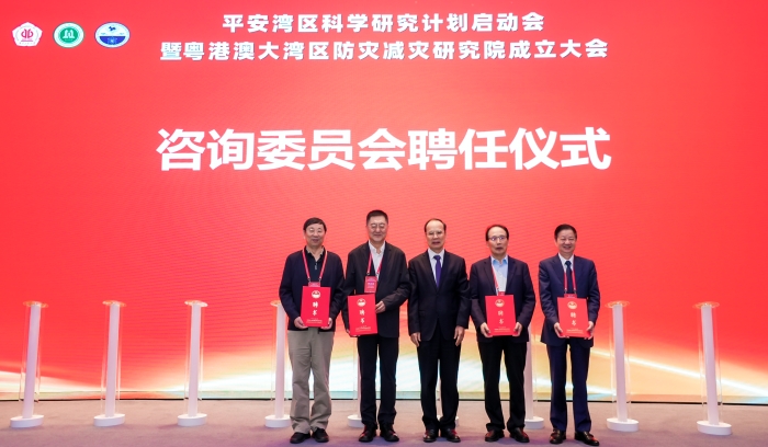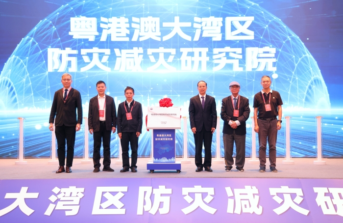 邱学青、李焯芬、胡杰、黄成造、何胜庄、张伟文共同为粤港澳大湾区防灾减灾研究院揭牌,标志着研究院正式成立。