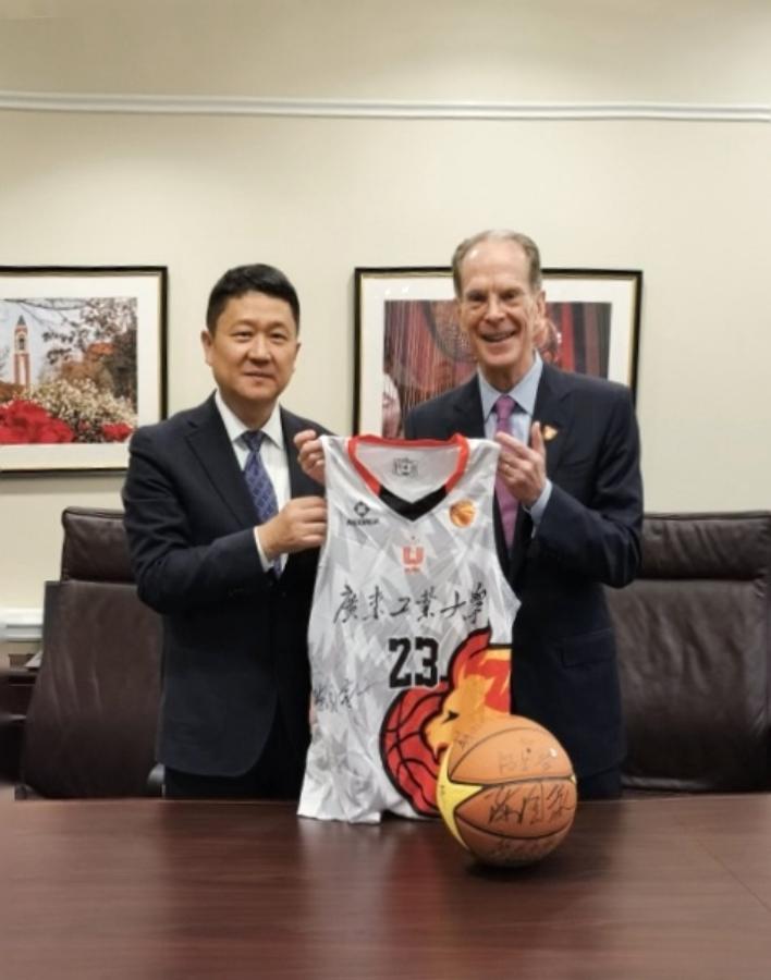 在波尔州立大学,广工代表团围绕推进数字经济中外合作办学项目与美方进行了深入交流,两校于2025年3月获批数字经济专业中外合作办学项目,已招收首批78名学生。为进一步深化合作,白建刚提出建立课程联合教学团队、促进师生互访、拓展信息工程等领域合作的建议,并诚挚邀请对方来华访问。波尔大学校长杰弗里·默恩斯表示会全力支持中外合作办学项目推进实施,并希望未来两校加强文体交流,特别是通过篮球竞技交流架起友谊的桥梁。