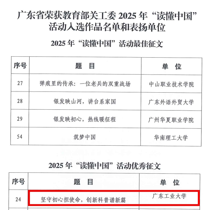 近日,教育部关工委与广东省教育系统关工委公布2025年“读懂中国”活动评审结果。广工关工委报送作品喜获佳绩:1篇征文入选教育部优秀作品,3篇征文分获省特等奖、一等奖、二等奖,2个微视频获省一等奖、二等奖;同时,我校获评教育部“表扬单位”和广东省“优秀组织奖”,实现奖项与荣誉双丰收。