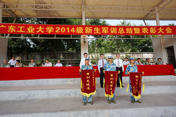 本网讯9月30日上午,我校2014级新生军训检阅暨总结表彰大会在大学城校园、东风路校区和龙洞校区同时进行。校长陈新,校党委副书记汤耀平、米银俊,副校长章云、陈立中、郝志峰、张光宇、陈卓武,副校级干部张学理分别出席三个校区的总结大会。出席总结大会的还有军训师师长、武警广东总队第二支队教导员胡明亮少校,广东省军区选培办主任张迪良上校,学校各部(处)、各学院负责人等。