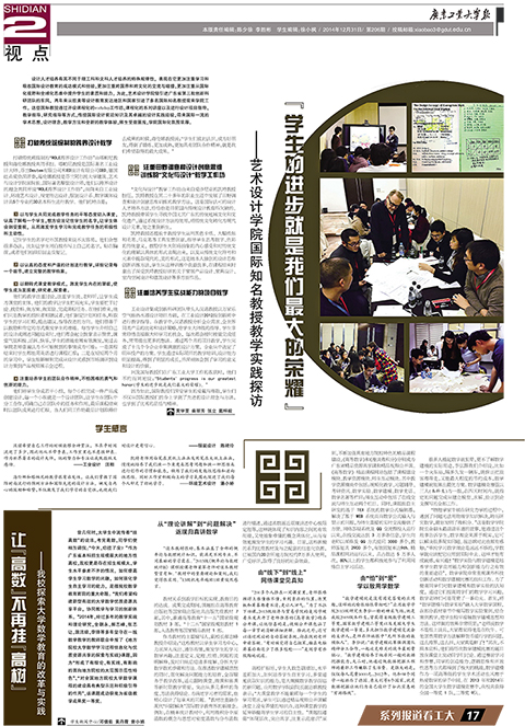 设计人才培养有其不同于理工科和文科人才培养的特殊规律性,表现在它更加注重学习和吸收国际设计教育的成功模式和经验,更加注重跨国界和跨文化的交流与碰撞,更加注重从国际化视野和全球化思维中提升学生的素质和能力。为此,艺术设计学院借引进广东省第三批创新科研团队的东风,两年来从欧美等设计教育发达地区和国家引进了多名国际知名教授前来学院工作。这些国际教授通过开设课程化的workshop工作坊、课程化的系列讲座以及进行设计项目指导、教学指导、研究指导等方式,传授国际设计前沿知识及其卓越的设计实践经验,带来国际一流的学术思想、设计理念、教学方法和全新的教学体验,师生受益匪浅,学院国际化氛围浓厚。