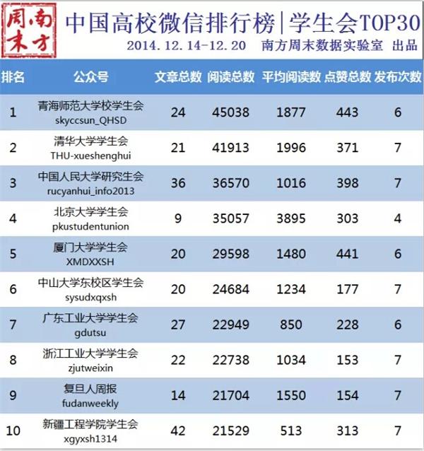 本网讯 12月22日,南方周末数据实验室发布12月14~20日中国高校微信排行榜。九游注册官方微信、学生会官方微信、社联官方微信都进入全国TOP30。