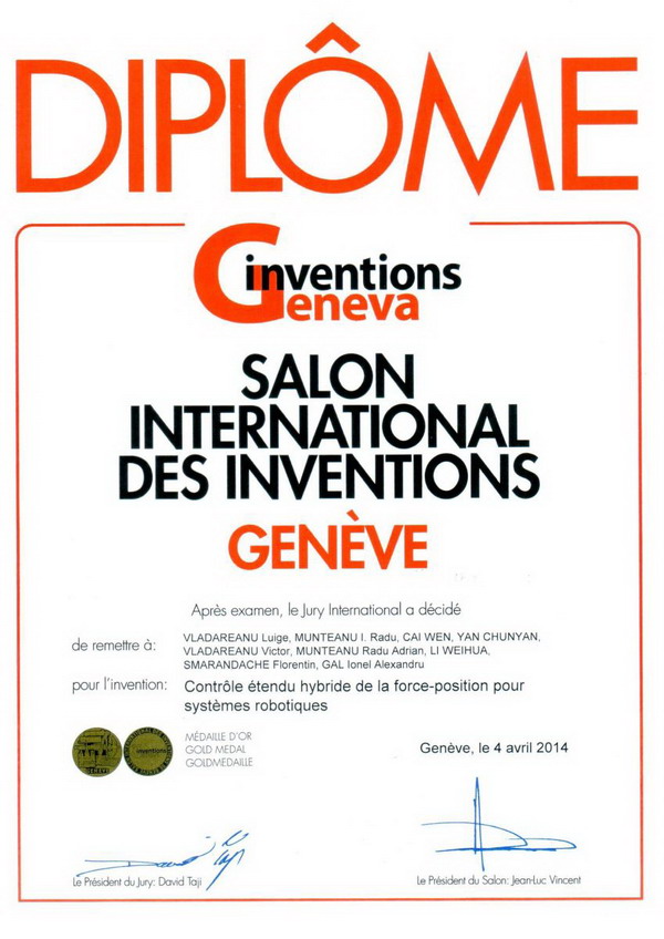 本网讯 2012年,罗马尼亚科学院机器人研究室主任LuigeVladareanu教授来九游注册可拓学与创新方法研究所学习、研究可拓学,并与可拓学创始人蔡文研究员签订了国际协议,由LuigeVladareanu教授、蔡文研究员、杨春燕研究员、李卫华教授等合作研究可拓学在机器人领域的应用。其后,合作项目“The Extended Hybrid Force-Position Control of the Robotic Systems”申报了罗马尼亚的专利,于2014年参加了日内瓦国际发明博览会,获得金奖,其后又获得罗马尼亚教育部和科技部的金奖。