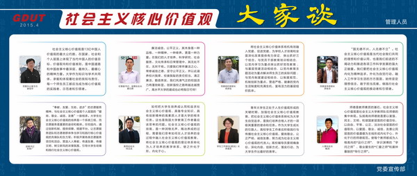 【编者按】社会主义核心价值观是社会主义核心价值体系的内核,体现社会主义核心价值体系的根本性质和基本特征,反映社会主义核心价值体系的丰富内涵和实践要求,是社会主义核心价值体系的高度凝练和集中表达。社会主义核心价值观包含12个词,共24个字,分别从国家、社会、公民三个层面提出社会主义核心价值观的价值目标、价值取向和价值准则。学校积极培育和践行社会主义核心价值观,各级管理人员、教师、学生从不同角度阐述了自身的认识和体会,现汇编以飨读者。