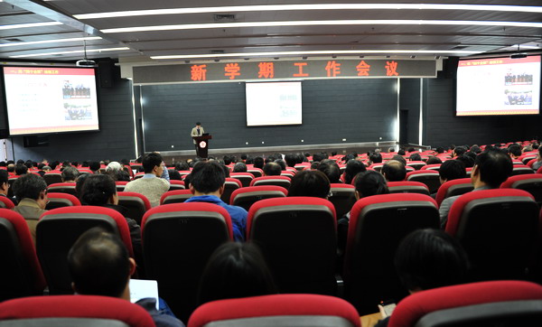 本网讯 3月10 日下午,我校在大学城校园召开新学期工作会议。校党委书记苏一凡就学校工作谈了总体思路,强调要以“四个全面”为统领,全面推进我校高水平大学建设是当前和今后一段时期的工作主线,以进一步提升我校办学水平和教育质量。校长陈新部署学校工作,提出要勇于改革创新,加强体制机制建设,实现新跨越新突破,努力推动学校建设高水平大学。