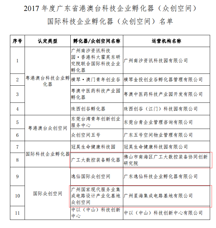 本网讯 12月13日,广东省科学技术厅公布了2017年度广东省粤港澳台科技企业孵化器(众创空间)和国际科技企业孵化器(众创空间)名单。广州国家IC基地成为获得认定的3家省级国际众创空间之一,佛山市南海区广工大数控装备协同创新研究院成为获得认定的2家国际科技企业孵化器之一。