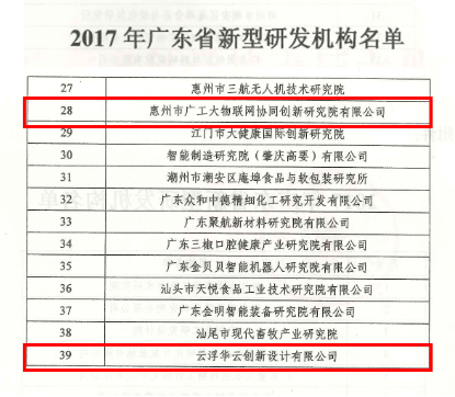 本网讯 近日,省科技厅公布了2017年广东省新型研发机构名单,惠州市广工大物联网协同创新研究院以及广东华南工业设计院负责运营的云浮创新设计中心(云浮华云创新设计有限公司)获得认定。截至目前,我校协同创新平台中已有6家省级新型研发机构。