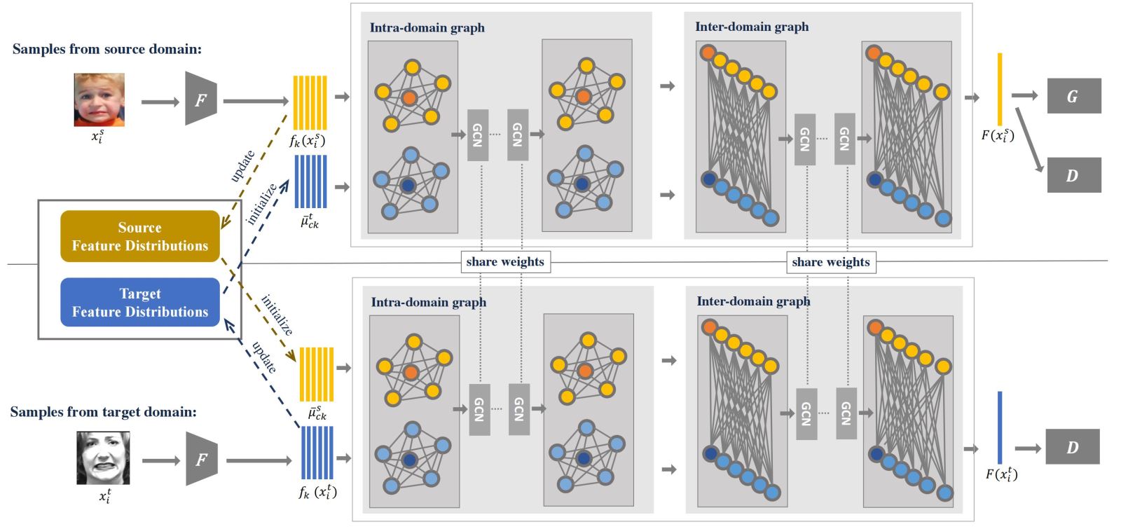 具体来说,该论文首先构建了一个统一且公平的评测基准,该基准复现了多个效果较好的跨域人脸表情识别方法,以及数个最新发表的通用领域自适应算法,并使用统一的源/目标域以及骨干网络选择,以此进行公平的比较评测。该基准可以公平评测各个工作提出的算法的有效性,更好地推进跨域人脸表情识别领域的发展。此外,该论文还提出了一个新的对抗图表达学习框架,该框架创造性地把图表示传播与对抗学习机制相结合,从而实现高效的跨域整体-局部表达协同迁移和学习。基于我们所提出的统一且公平的评测基准,该框架取得了优于所有现有方法的效果。