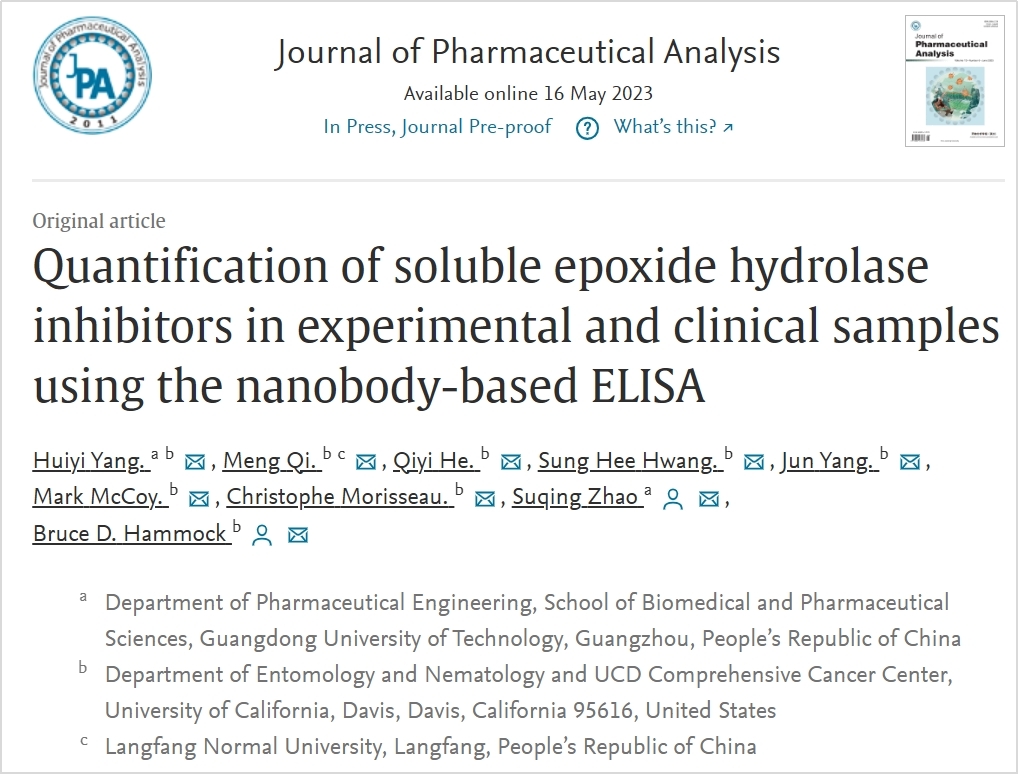 2023年5月,九游注册生物医药学院赵肃清教授团队在药学顶级期刊《Journal of Pharmaceutical Analysis》发表研究论文。论文题为“Quantification of soluble epoxide hydrolase inhibitors in experimental and clinical samples using the nanobody-based ELISA”(https://doi.org/10.1016/j.jpha.2023.05.006),该论文第一作者为我校生物医药学院20级博士研究生杨慧怡,通讯作者为赵肃清教授和Bruce D. Hammock院士。我校为论文第一完成单位,合作单位为美国加州大学戴维斯分校(University of California, Davis)。
