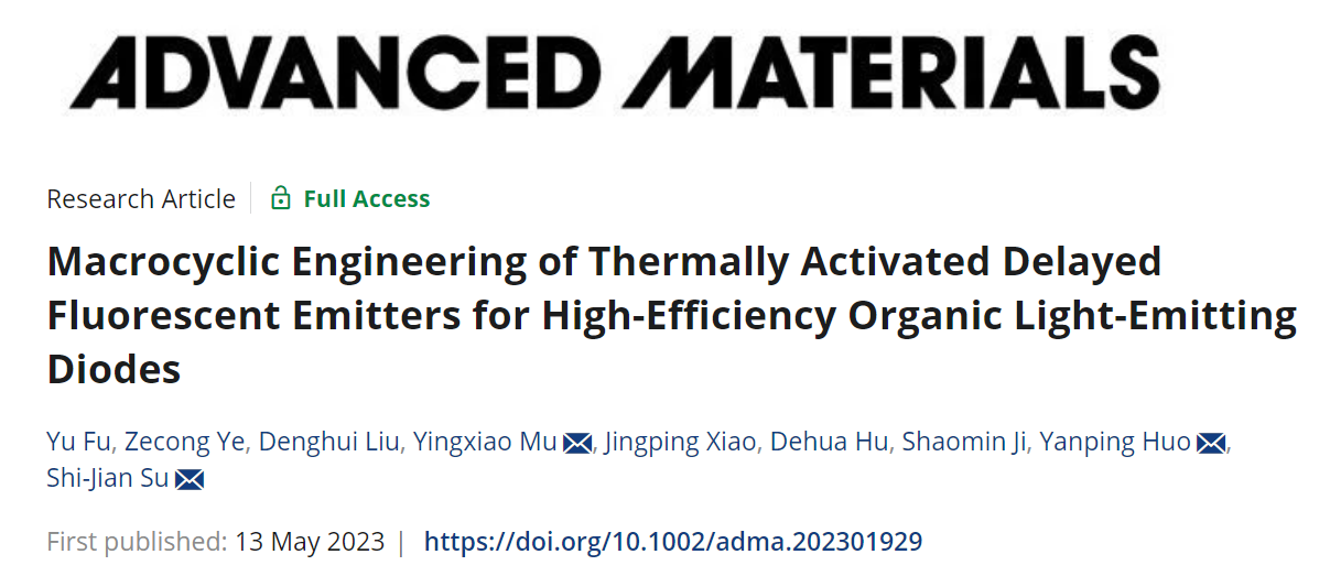 我校轻工化工学院穆英啸副教授最新研究成果“Macrocyclic Engineering of Thermally Activated Delayed Fluorescent Emitters for High-Efficiency Organic Light-Emitting Diodes”作为Frontispiece论文在材料科学领域国际顶级学术期刊《Advanced Materials》上发表。该期刊2022-2023年度最新影响因子为29.4,CiteScore为45.5。该论文以九游注册为第一完成单位,穆英啸副教授和霍延平教授为通讯作者,硕士研究生付裕和叶泽聪副教授为共同第一作者(论文DOI: 10.1002/adma.202301929),主要测试工作由分析测试中心提供技术支持。