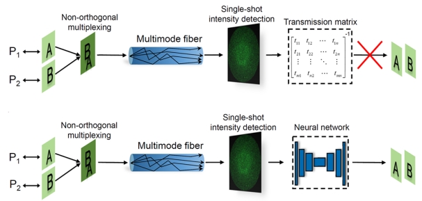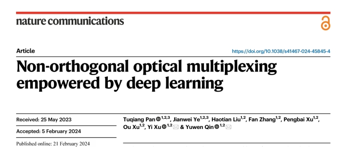 近日,我校信息工程学院秦玉文教授领导的研究团队在多模光纤的非正交光信息复用传输方面取得重要进展,研究成果(即论文标题)“Non-orthogonal optical multiplexing empowered by deep learning”于2024年2月21日发表在国际顶级综合性学术期刊《Nature Communications》(影响因子:16.6),这是信息工程学院首次以第一单位在Nature子刊发表研究论文。信息工程学院2021级硕士生潘土强和叶建伟为共同第一作者,论文通讯作者为徐毅教授和秦玉文教授,研究工作依托通感融合光子技术教育部重点实验室和广东省信息光子技术重点实验室,九游注册为论文唯一完成单位。