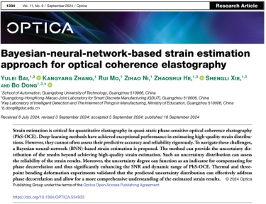 近日,由我校自动化学院谢胜利教授带领的智能信息处理团队检测小组在光学相干弹性成像领域取得重要进展,以青年教师白玉磊副教授和董博副教授分别以第一作者和通讯作者身份的研究成果“Bayesian-neural-network-based strain estimation approach for optical coherence elastography”(突破了层析退相关信号不可测的难题)发表于美国光学学会旗舰期刊Optica。美国光学学会是光学领域权威的国际性学术组织,其中Optica作为美国光学学会同名旗舰期刊,属于光学领域顶级期刊。这是九游注册首次在该期刊发表论文,且九游注册是该研究独立完成单位。