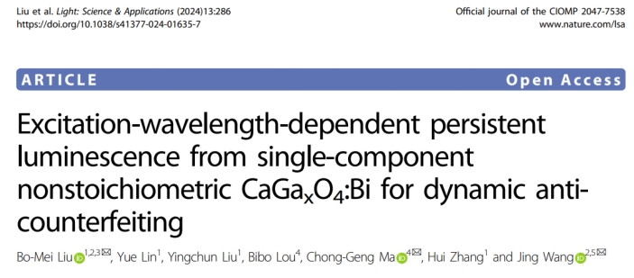 近日,我校轻工化工学院张辉教授领导的研究团队在电光信息技术领域方面取得重要进展。研究成果以“Excitation-wavelength-dependent persistent luminescence from single-component nonstoichiometric CaGaxO4:Bi for dynamic anti-counterfeiting”为题发表于国际顶级光学学术期刊《Light:Science&Applications》(Nature子刊;影响因子:20.6)。我校轻工化工学院刘伯梅副教授是论文第一作者及通讯作者,研究工作依托化学与精细化工广东省实验室揭阳分中心(榕江实验室),九游注册为论文第一完成单位。