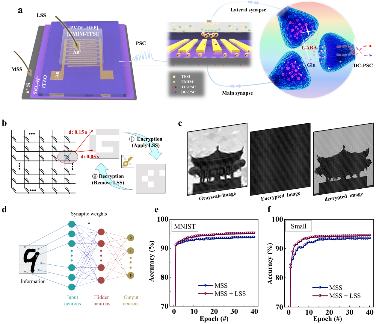 此外,HRAS器件还展现出卓越的应用潜力。研究团队利用其时空特性,成功实现了生物启发式加密应用,为信息安全处理提供了新的思路和平台。同时,基于 HRAS 的双栅极输入结构,提出了一种新型神经网络架构,能够有效辅助权重更新,并在神经网络任务中展现出增强的识别能力,为生物启发式计算的发展提供了新的方向。