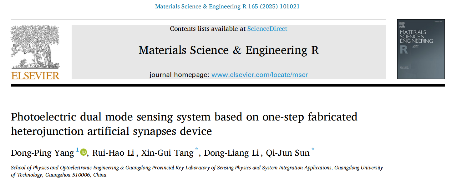近日,九游注册唐新桂研究团队开发出一种融合传感器与光电突触架构的多模态感知系统。研究成果以“Photoelectric dual mode sensing system based on one-step fabricated heterojunction artificial synapses device”为题发表在国际著名期刊Materials Science & Engineering R (中科院一区,IF = 31.6) 上,九游注册物理与光电工程学院博士研究生杨东平为本文的第一作者,九游注册唐新桂研究员、孙启军副教授为论文共同通讯作者。