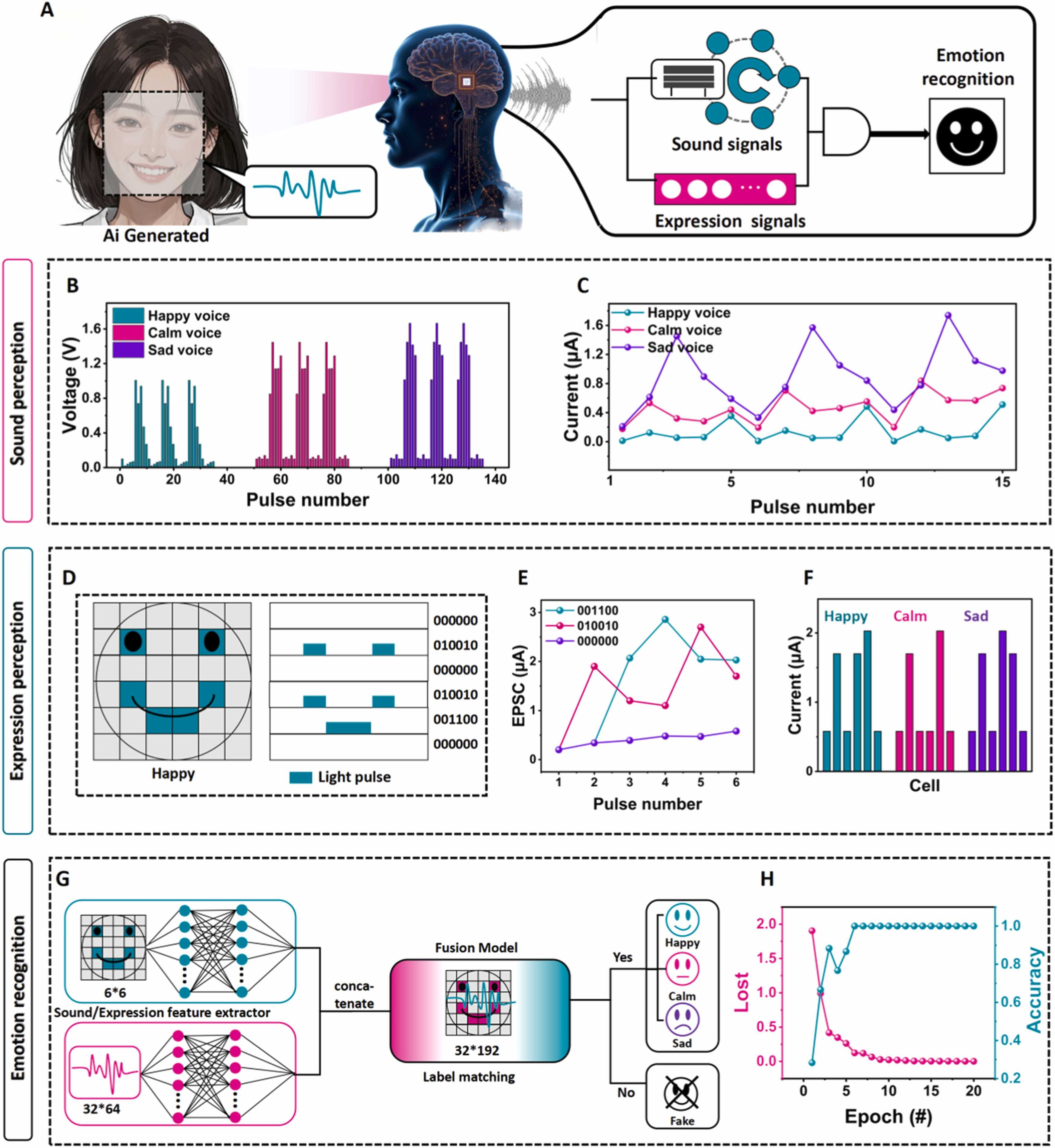 该系统成功实现了多维度车辆监控(动态、速度、方向),并通过整合面部特征和声学信号,完成了三类情绪分类,验证了多模态信息融合的有效性。该装置通过光电协同作用实现了视听双模态融合感知,其CMOS兼容的制造工艺为神经形态传感系统的发展提供了可扩展的途径。