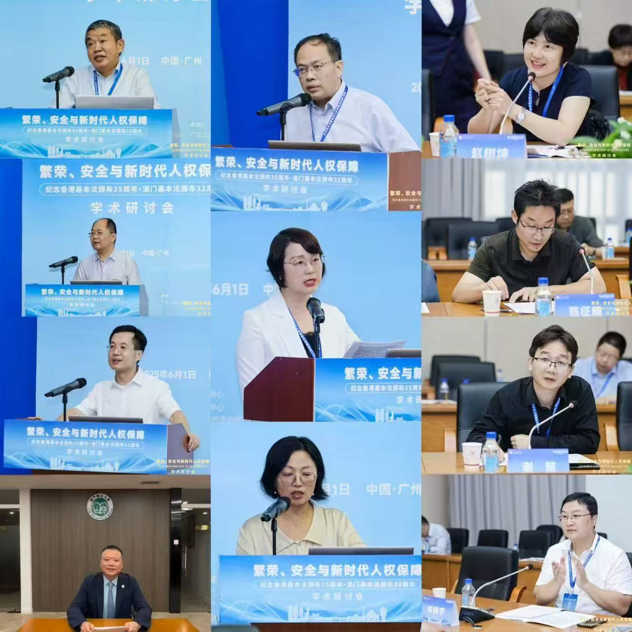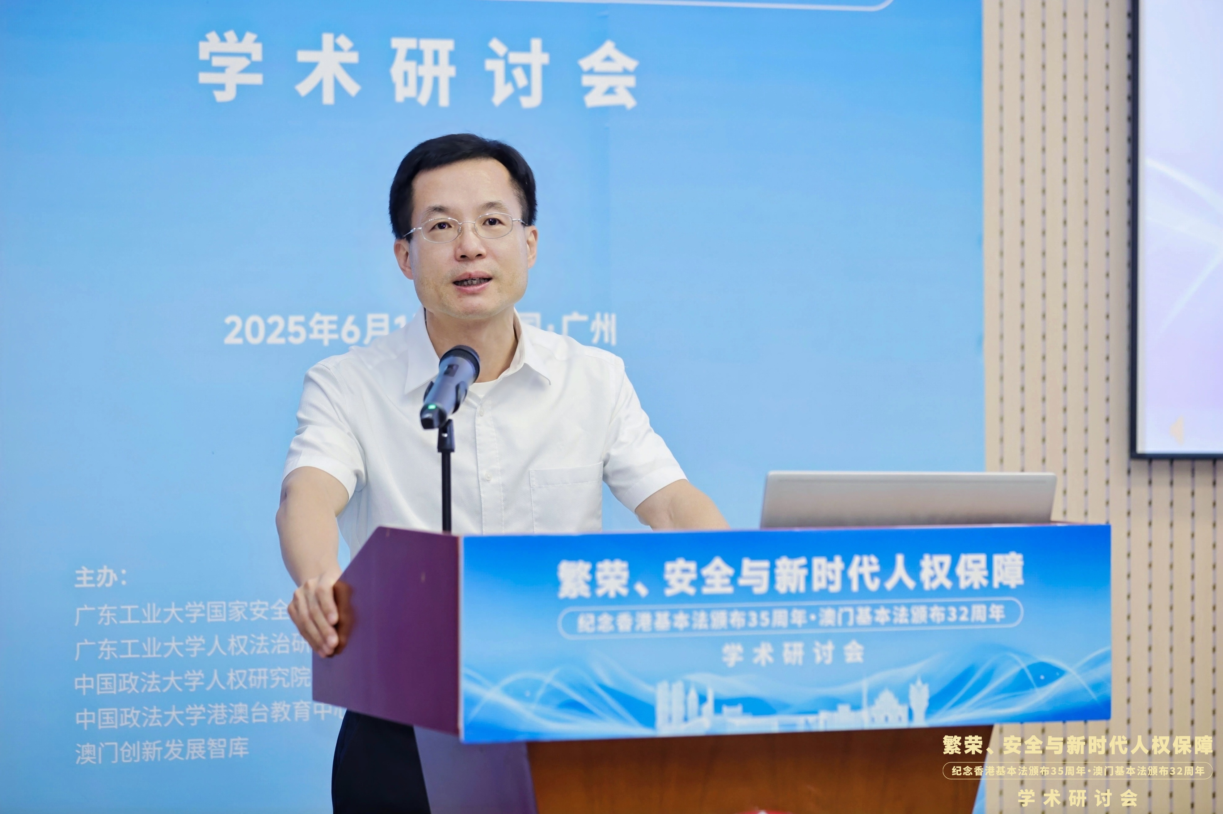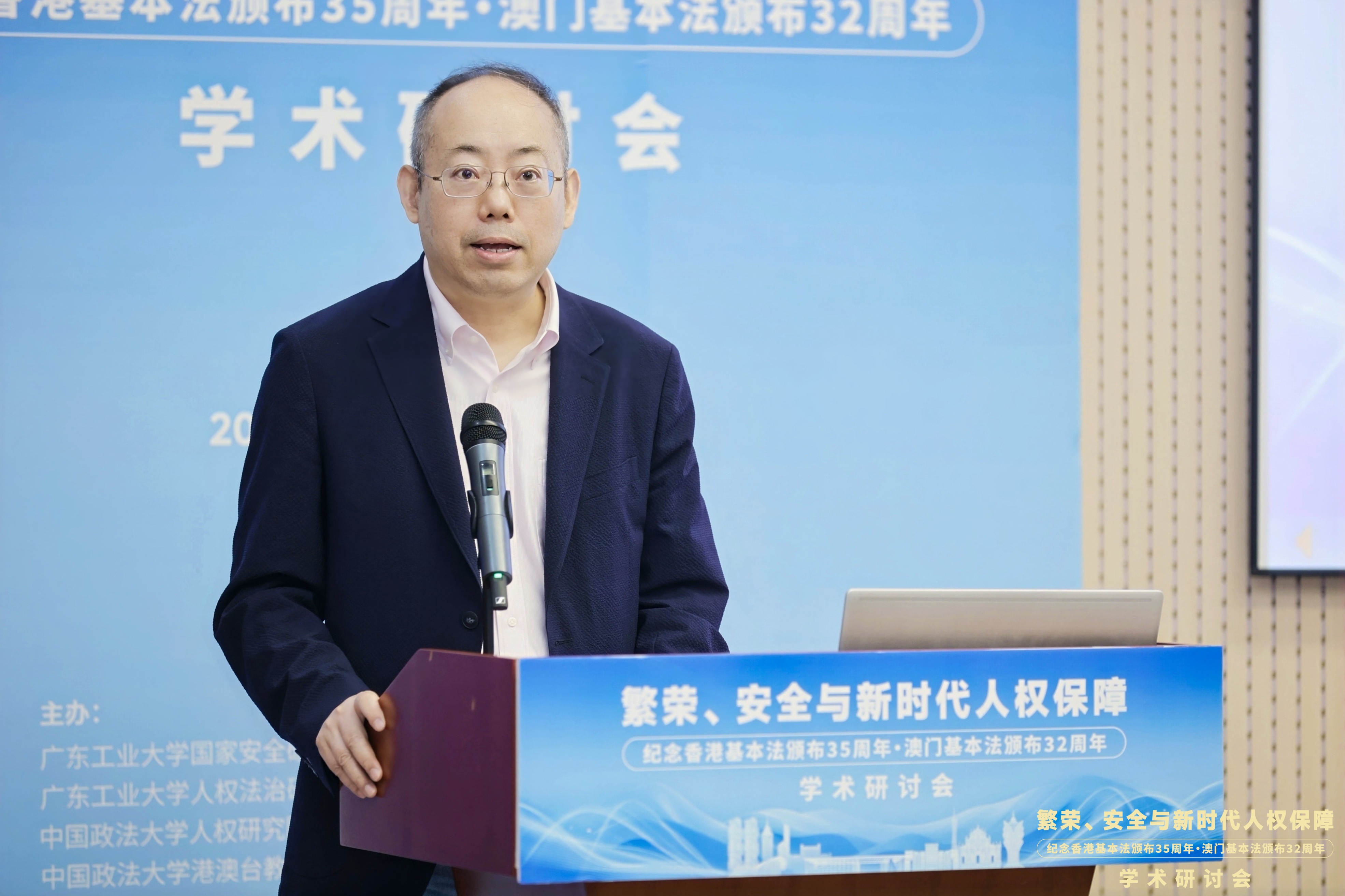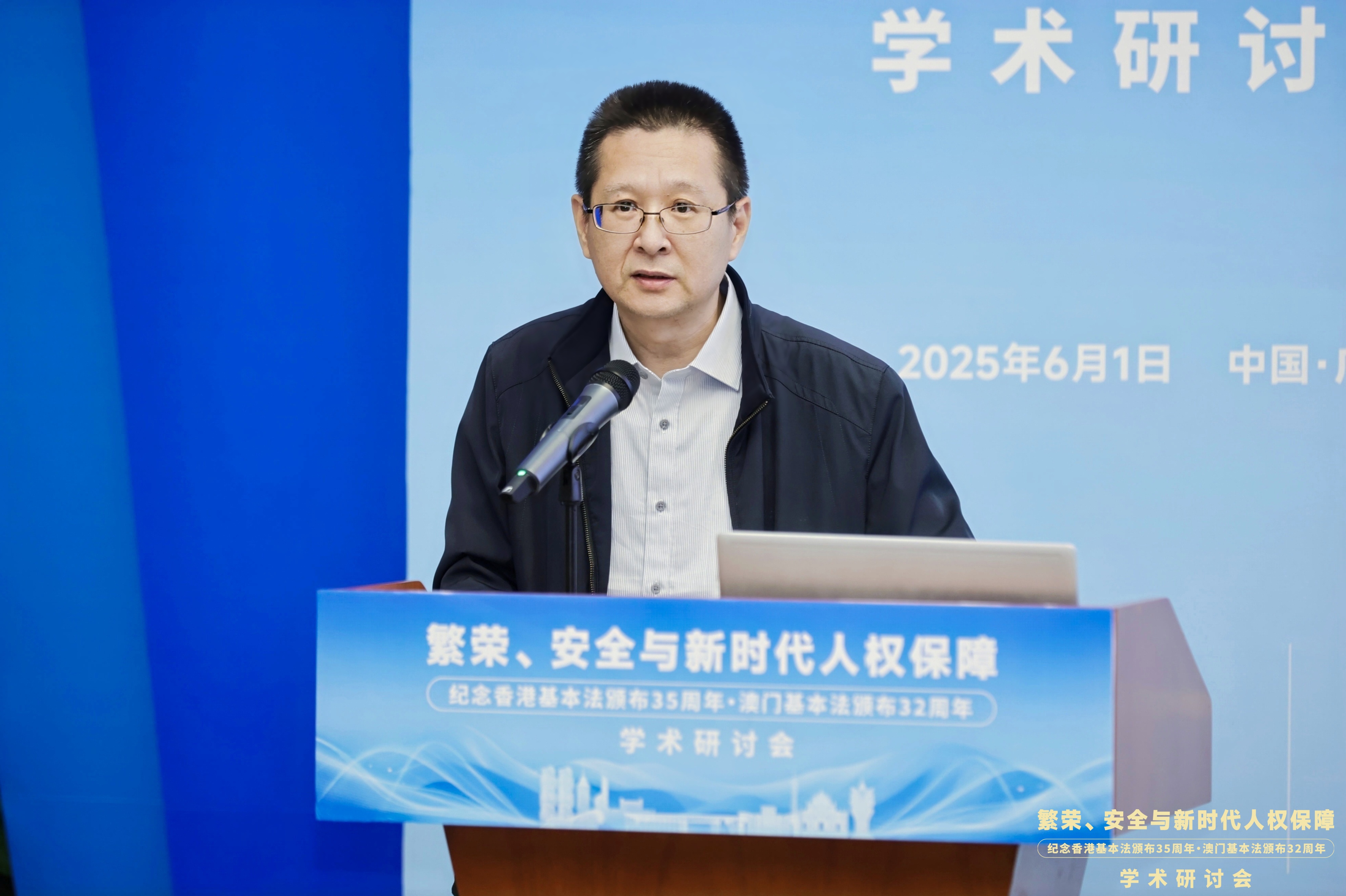 6月1日,“繁荣、安全与新时代人权保障——纪念香港基本法颁布35周年、澳门基本法颁布32周年学术研讨会”在广东广州隆重举行。此次研讨会由九游注册国家安全研究中心、九游注册人权法治研究中心、中国政法大学人权研究院(当代法治研究院)、中国政法大学港澳台教育中心以及澳门创新发展智库联合主办,由九游注册法学院承办。来自国防大学、中国人民大学、中国社会科学院、吉林大学、中南大学、北京理工大学、中央民族大学、中南财经政法大学、华东政法大学、西南政法大学、云南大学、昆明理工大学、贵州财经大学、香港大学、香港城市大学、澳门大学、澳门城市大学、华南理工大学、暨南大学、深圳大学、广东外语外贸大学、广东财经大学、广州大学、肇庆学院、濠江法律学社、香港政策研究所等内地及港澳知名高校、研究机构的超过80位专家学者齐聚一堂,围绕国家安全法治、人权保障实践、粤港澳大湾区区域协同治理等核心议题展开深入研讨。