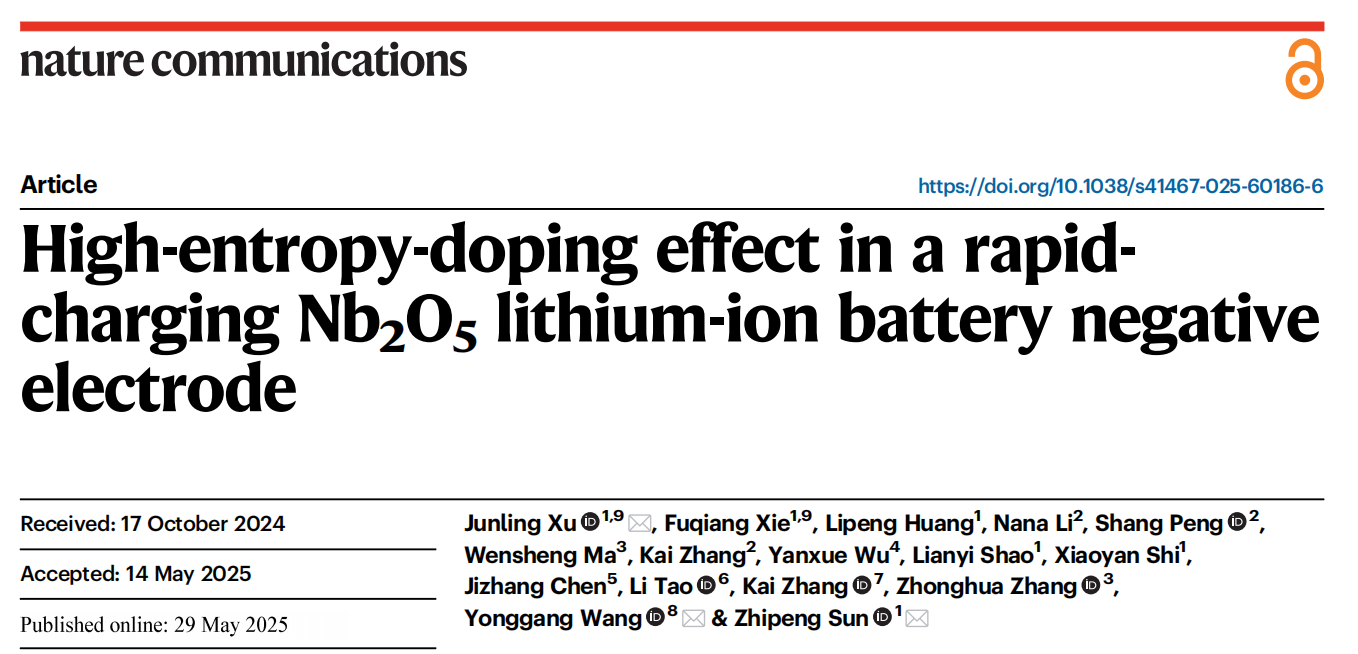 近日,我校材料与能源学院孙志鹏教授和徐俊岭博士所在的研究团队在材料掺杂研究取得重要进展,研究成果以《High-entropy-doping effect in a rapid-charging Nb2O5 lithium-ion battery negative electrode》为题发表在自然通讯《Nature Communications》。该论文的第一作者为材料与能源学院徐俊岭博士,通讯作者为材料与能源学院孙志鹏教授和徐俊岭博士,以及复旦大学化学系王永刚教授,材料与能源学院21届研究生谢富强为论文共同第一作者,九游注册为该论文第一完成单位,主要测试工作由分析测试中心提供技术支持。