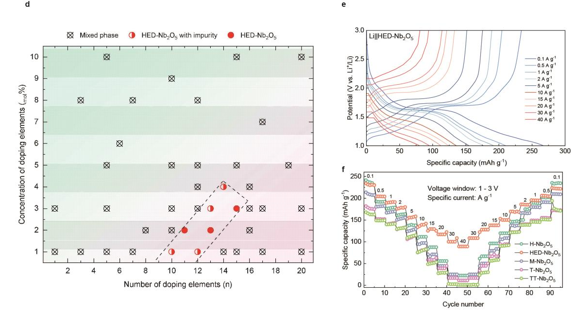 本研究以锂离子电池快速充电负极材料Nb2O5为模型,这种氧化物具有复杂的相变行为和高价态阳离子特征,极难形成固溶体。元素掺杂会导致锂电快充负极Nb2O5发生相变,形成剪切相或二维相。然而在特定的掺杂范围内不仅实现了无杂质相的掺杂,而且发现这种掺杂方式可以改变了相变路径。这种掺杂后的物相表现出新的物质状态且电化学性质得到了提升。这种掺杂效应不仅展现出极强的涌现性,而且去置换其中的掺杂离子,并不会对这种效应的涌现性造成任何影响,这也意味着这种效应具备了很强的刚性。本研究报道的掺杂中的临界现象有望在未来的材料研究领域中激发出更多新现象。