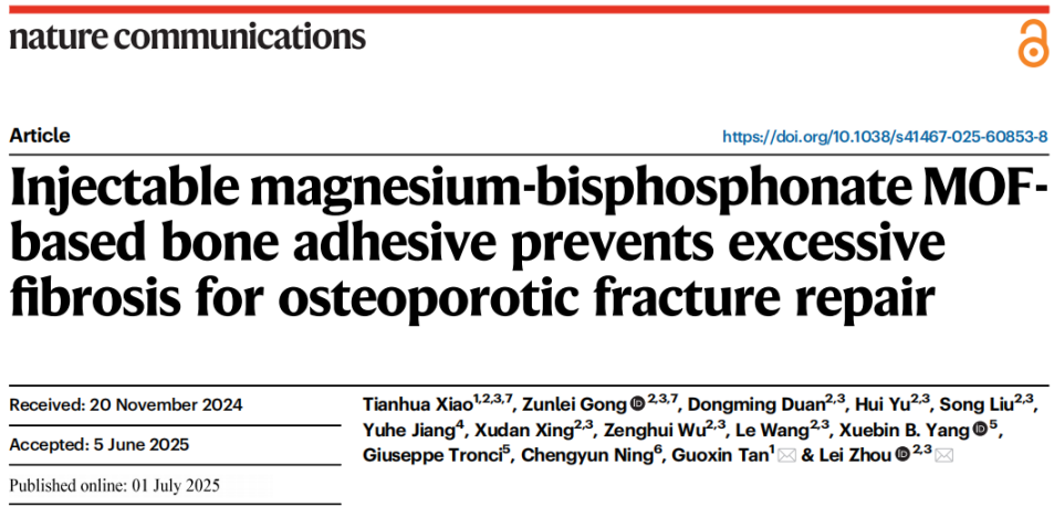 近日,我校轻工化工学院谭帼馨教授团队在骨质疏松性骨折修复研究中取得重要进展,研究成果以《Injectable magnesium-bisphosphonate MOF-based bone adhesive prevents excessive fibrosis for osteoporotic fracture repair》为题发表在自然通讯《Nature Communications》。该论文的第一作者为我校轻工化工学院肖天华博士生,通讯作者为我校轻工化工学院谭帼馨教授,广州医科大学附属第三医院周蕾研究员,广州医科大学附属第三医院巩尊磊博士后为论文共同第一作者,九游注册为该论文第一完成单位,主要测试工作由分析测试中心提供技术支持。