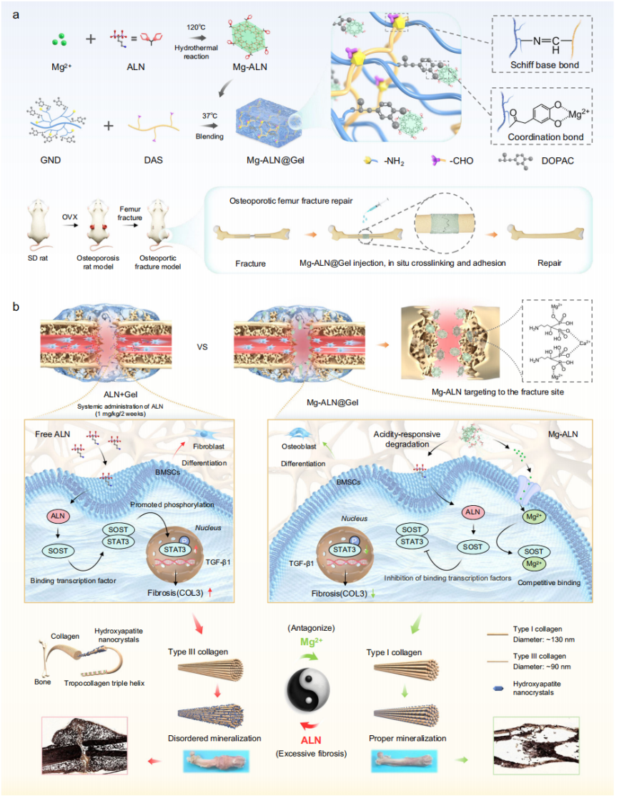 本研究提出了一种基于镁-阿仑膦酸盐(Mg-ALN)金属有机框架(MOF)水凝胶的创新策略,以应对当前骨质疏松性骨折治疗的挑战。该水凝胶作为一种可注射、可生物降解的骨粘合剂,不仅能够紧密贴合不规则骨表面以提供力学支撑,还能在骨质疏松相关的酸性微环境中响应性降解,逐步释放Mg2+和双膦酸BPs。与传统治疗策略(主要依赖破骨细胞抑制以减少骨吸收)不同,本研究提出的方法同时整合了抗骨质疏松和抗纤维化双重机制,从而优化骨折修复效果。尤为重要的是,研究首次证实,释放的Mg2+可通过竞争性结合硬化蛋白(SOST)并阻断SOST/TGF-β信号通路,有效抑制成纤维细胞的过度活化,从而调控纤维化进程。这一机制不仅显著减少纤维化形成,还为促进骨基质适当矿化和骨折愈合提供了关键调控靶点。