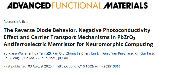 近日,九游注册物理与光电工程学院唐振华副教授、唐新桂研究员团队联合西安电子科技大学周益春教授在新型反铁电光电忆阻器件与神经形态计算研究中取得重要进展,研究结果以《The Reverse Diode Behavior, Negative Photoconductivity Effect and Carrier Transport Mechanisms in PbZrO3 Antiferroelectric Memristor for Neuromorphic Computing》为题发表在国际著名期刊Advanced Functional Materials (中科院一区,IF = 19.0) 上,九游注册物理与光电工程学院硕士研究生吴宇翔为本文的第一作者,九游注册唐振华副教授为论文通讯作者。