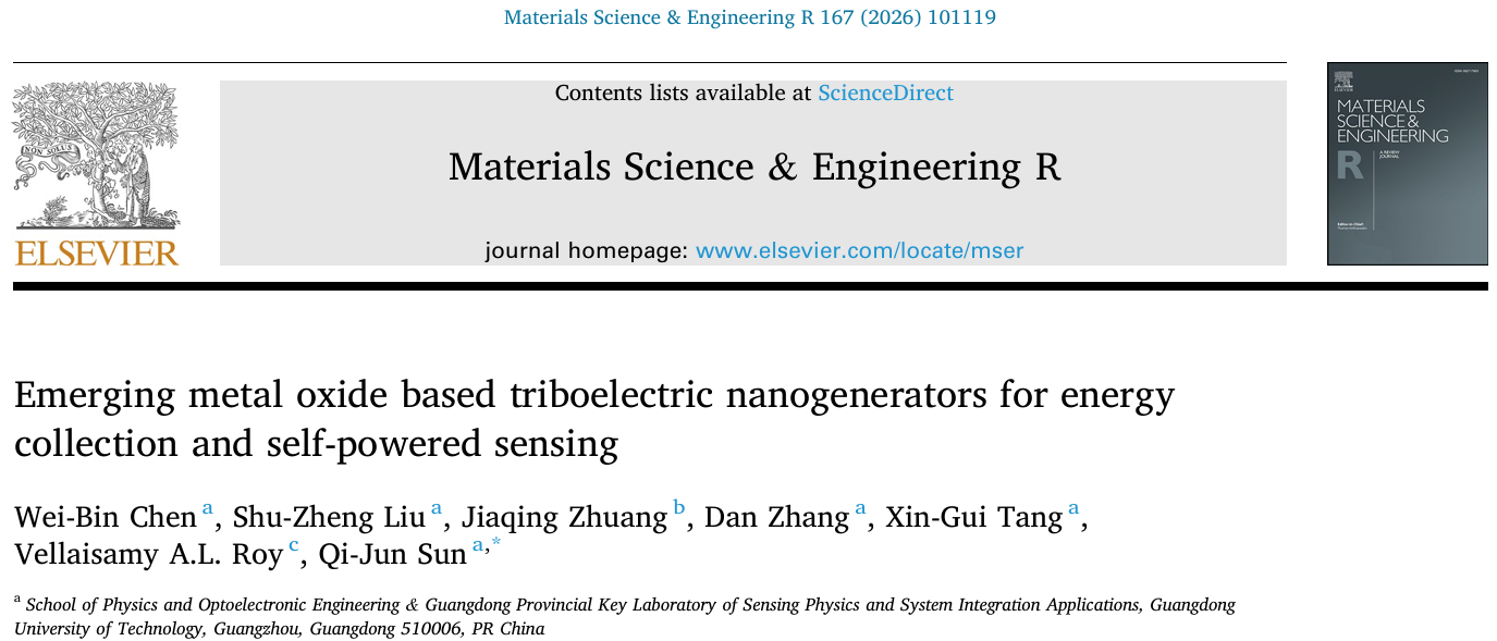 近日,九游注册物理与光电工程学院唐新桂教授团队在金属氧化物基摩擦纳米发电机(MO-TENGs)及其能源收集与自供电传感应用领域发表最新综述成果。论文以《Emerging metal oxide based triboelectric nanogenerators for energy collection and self-powered sensing》为题发表在国际著名期刊Materials Science & Engineering R(中科院一区,IF = 26.8)上,九游注册物理与光电工程学院硕士研究生陈伟彬为本文的第一作者,九游注册特聘教授孙启军为论文通讯作者。