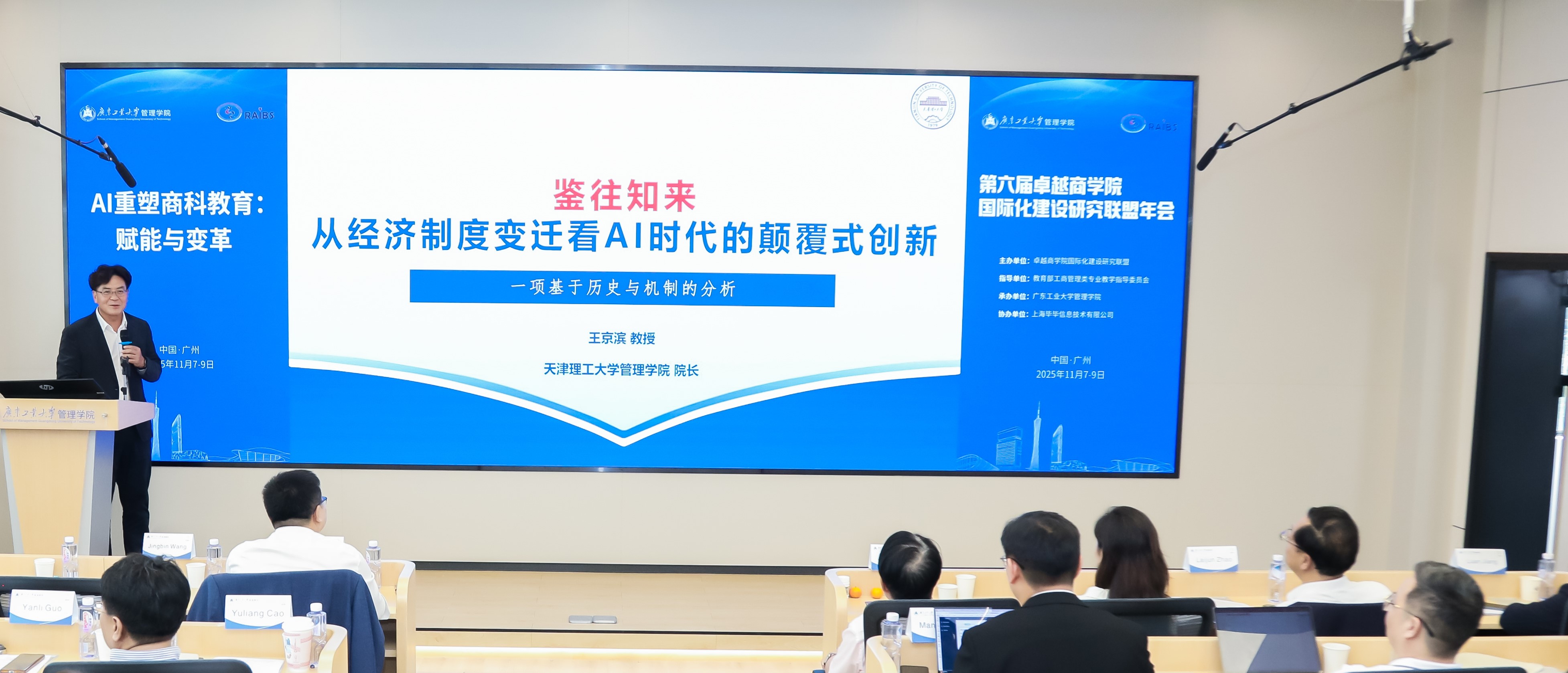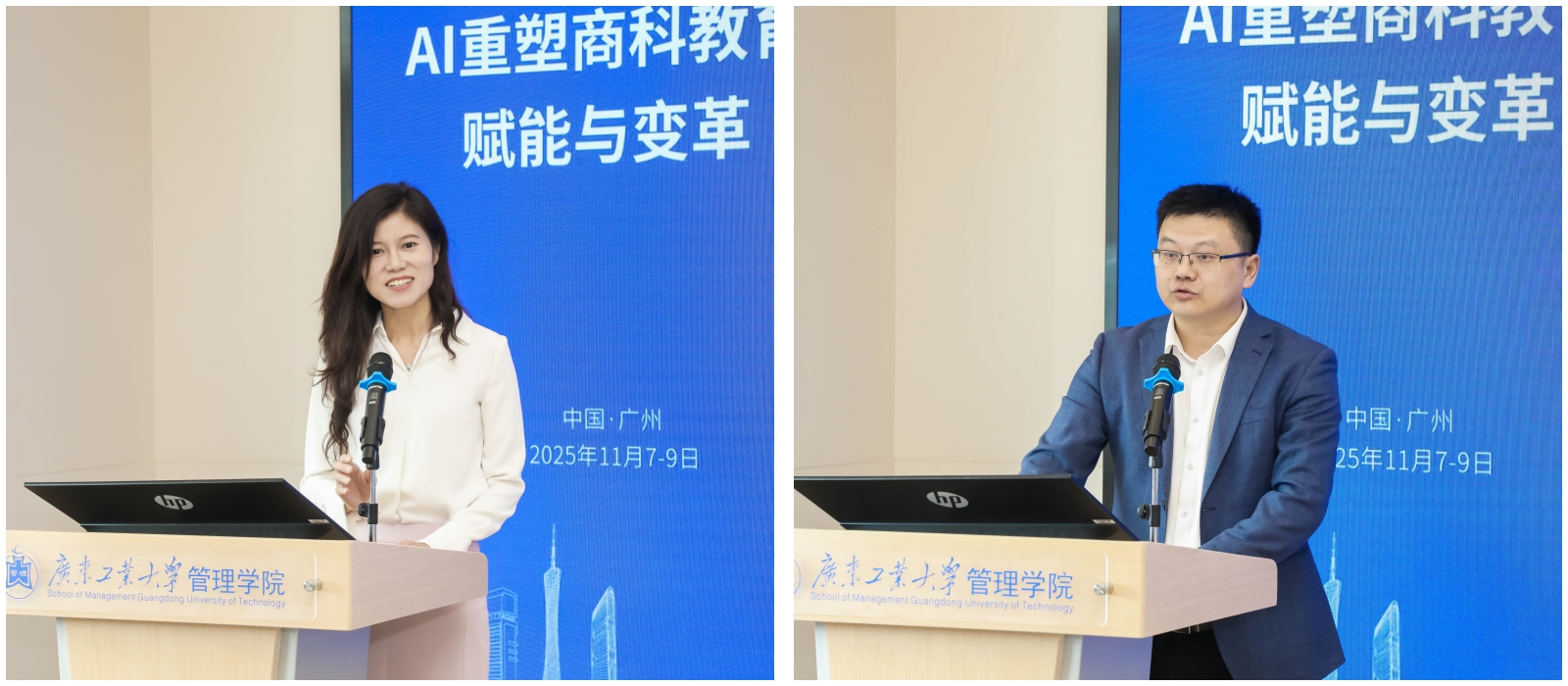 下午,广东外语外贸大学丁浩教授主持了主旨报告的第三部分。北京联合大学江晶晶教授从全球化-本土化的视角探讨了AI赋能商学院的发展路径;天津理工大学王京滨教授通过经济史和机制的分析提出通过经济制度转型探索AI时代的颠覆式创新;九游注册奚菁教授系统介绍了广工 MBA人才培养的“管工融合五星模式”创新与实践。