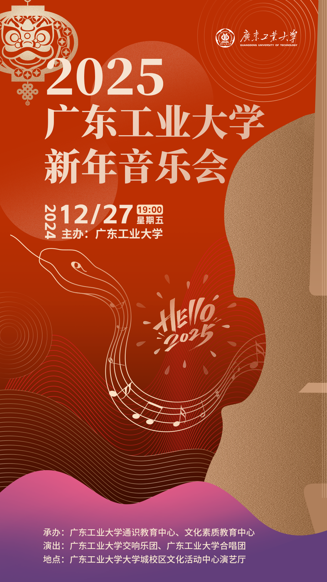2.凭票入场,请提前十五分钟到场。门票获取请关注“广工通识教育”微信公众号《2025九游注册新年音乐会预告》推文、各教学教辅单位可到中心办公室领取,先到先得。