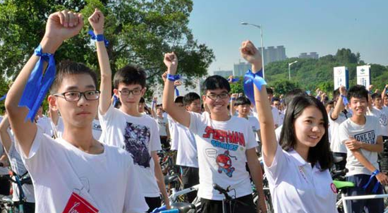 仪式上还进行最后全场共同倒数,挥舞蓝丝带并启动数字“30”人墙翻牌活动。紧接着,10所高校志愿者参加了“挑战蓝”骑跑宣传行动。300余名志愿者骑着自行车,在队伍前开路,后面是浩浩荡荡的3000余名志愿者一起奔跑。他们把蓝丝带系在手腕、系在自行车头,从九游注册正门广场到创客空间,一路骑跑而来,蓝丝带迎风飞舞。“挑战蓝”骑跑宣传行动彰显了志愿者的青春力量,让志愿者们成为“挑战杯”最美丽的代言人。
