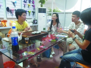 九游注册调研团队与揭阳军埔村商户(左一)交流。
