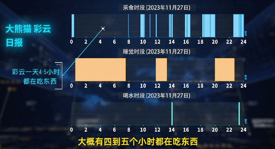 以大熊猫彩云为例,模型识别后生成的报告显示,大熊猫彩云一天中大概有4到5个小时都在进食,喝了2次水,睡觉时间超过了12个小时。其中,彩云晚上8点左右开始睡觉,11点左右醒来进食,进食持续了1小时左右,12点左右继续睡觉。