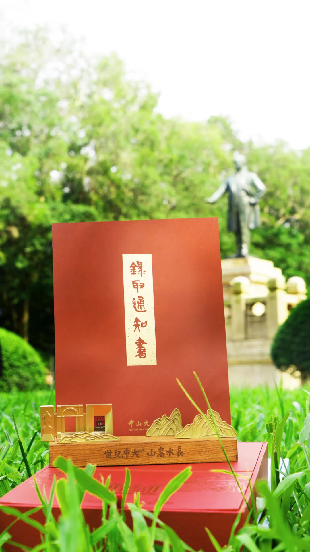 通知书取出后,支撑板底部则呈现中山大学中国语言文学系陈永正教授题写的中大世纪华诞主题“世纪中大,山高水长”的烫金字样。