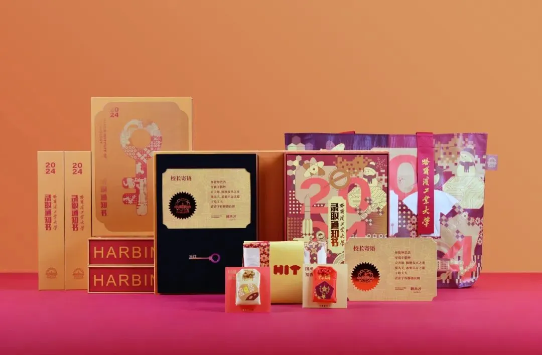 下方是学校送给学子的专属钥匙。右侧是录取通知书,通知书图案提炼了哈尔滨和学校的标志性元素,录取通知书下面分别是同款套色的福袋和礼袋。