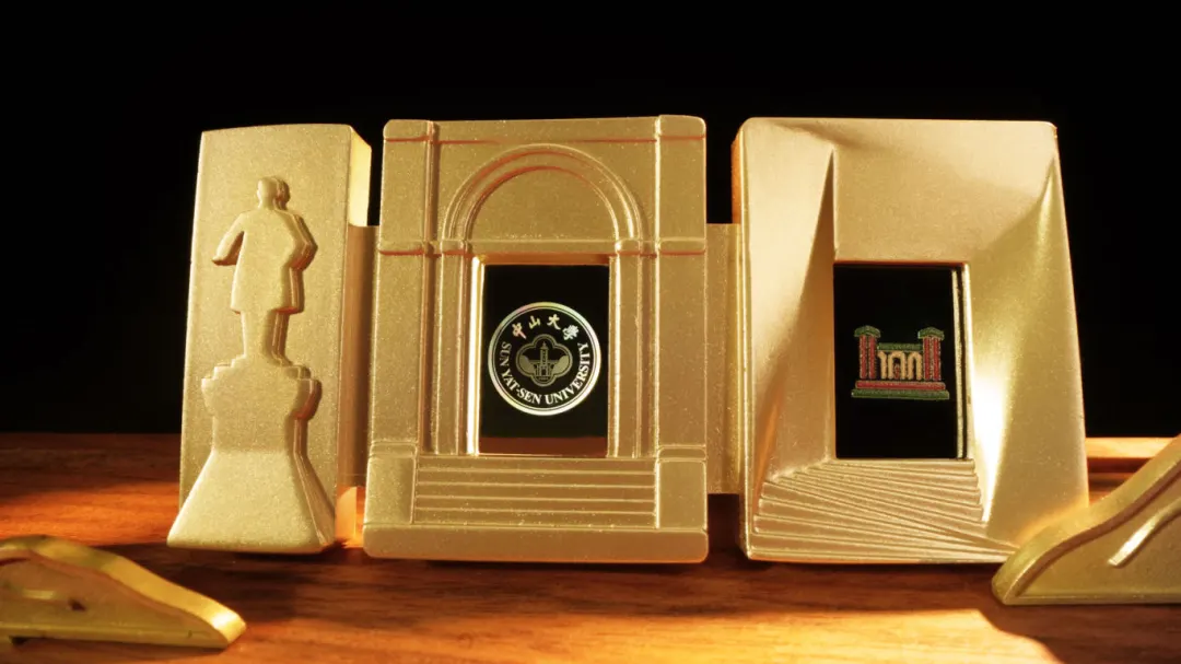 “世纪之门”徽章通体为金色,用数字“100”的形态汇聚光影。“1”的形象源自南校园中轴线上的孙中山先生铜像。在“1”之后,第一个“0”的造型为富有历史感的拱门,灵感源自怀士堂大门。