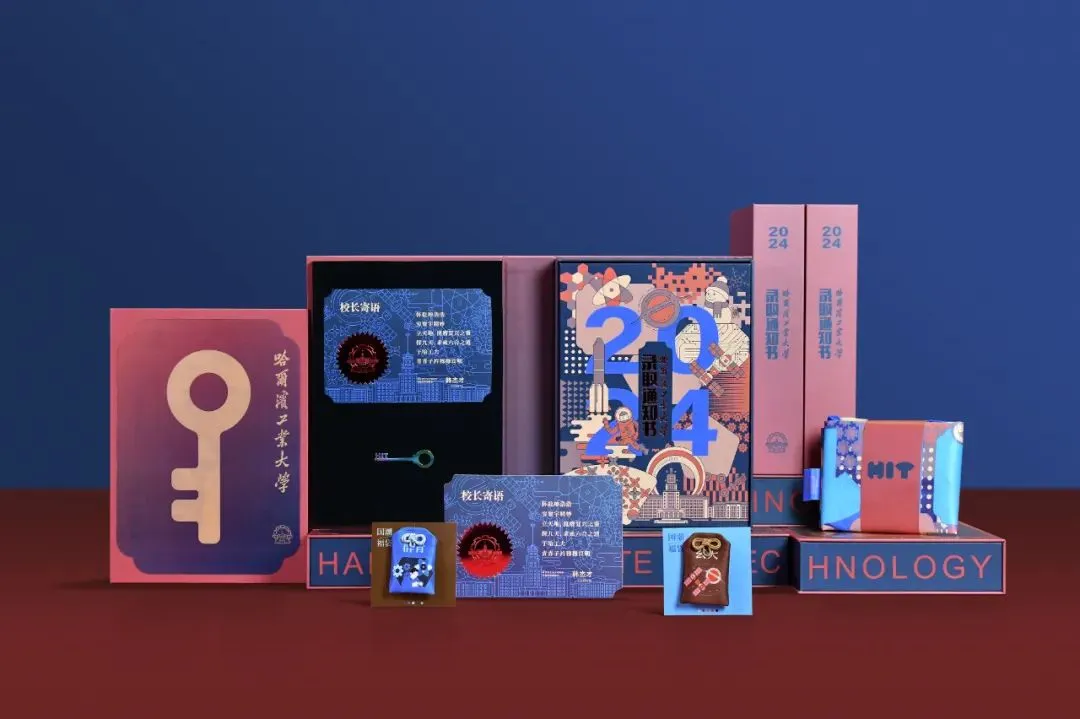 除了展示硬核科技,哈工大2024年录取通知书还融入了中国传统色和学校标志性元素。通知书整体设计以“书”的外形呈现,书盒封面采用可变换图案的光栅工艺,主图形以钥匙的轮廓呈现。
