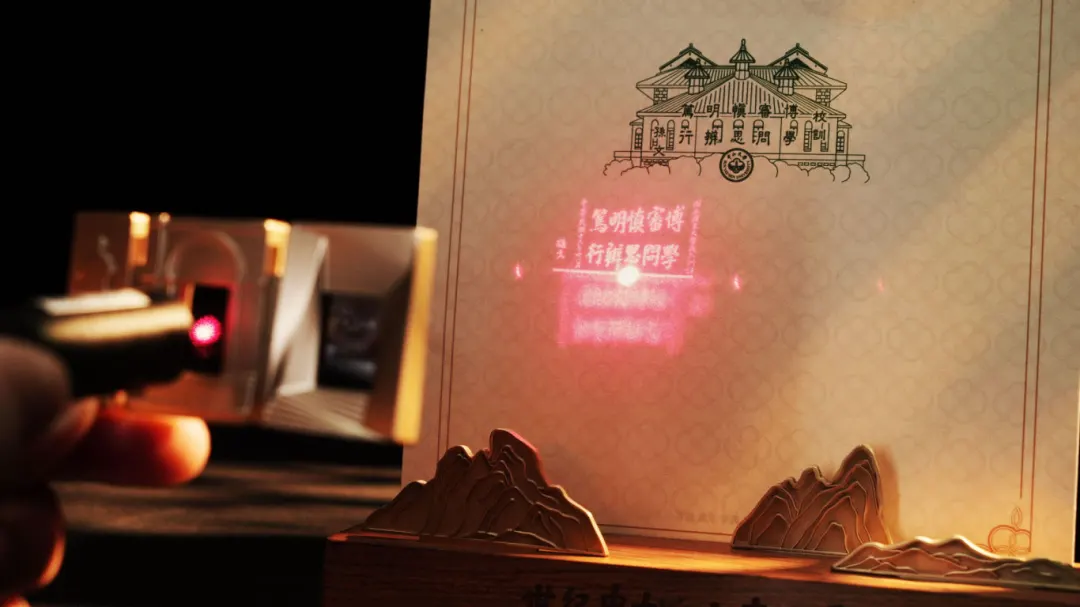 第一个“0”中镶嵌的透射石英片刻有中大校徽,可以通过光源(如手机手电筒)投射孙中山先生亲手题写的中山大学校训的全息图案。